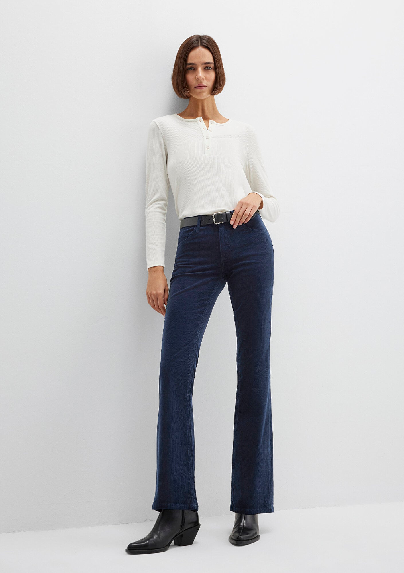 Mavi nin kadın koleksiyonundan Molly Lacivert Kadife Pantolon. Bel ve basene oturan, normal bel, modern klasik kesim Bootcut kadife pantolon. Baldırdan sonra hafif açılan çizme paça.