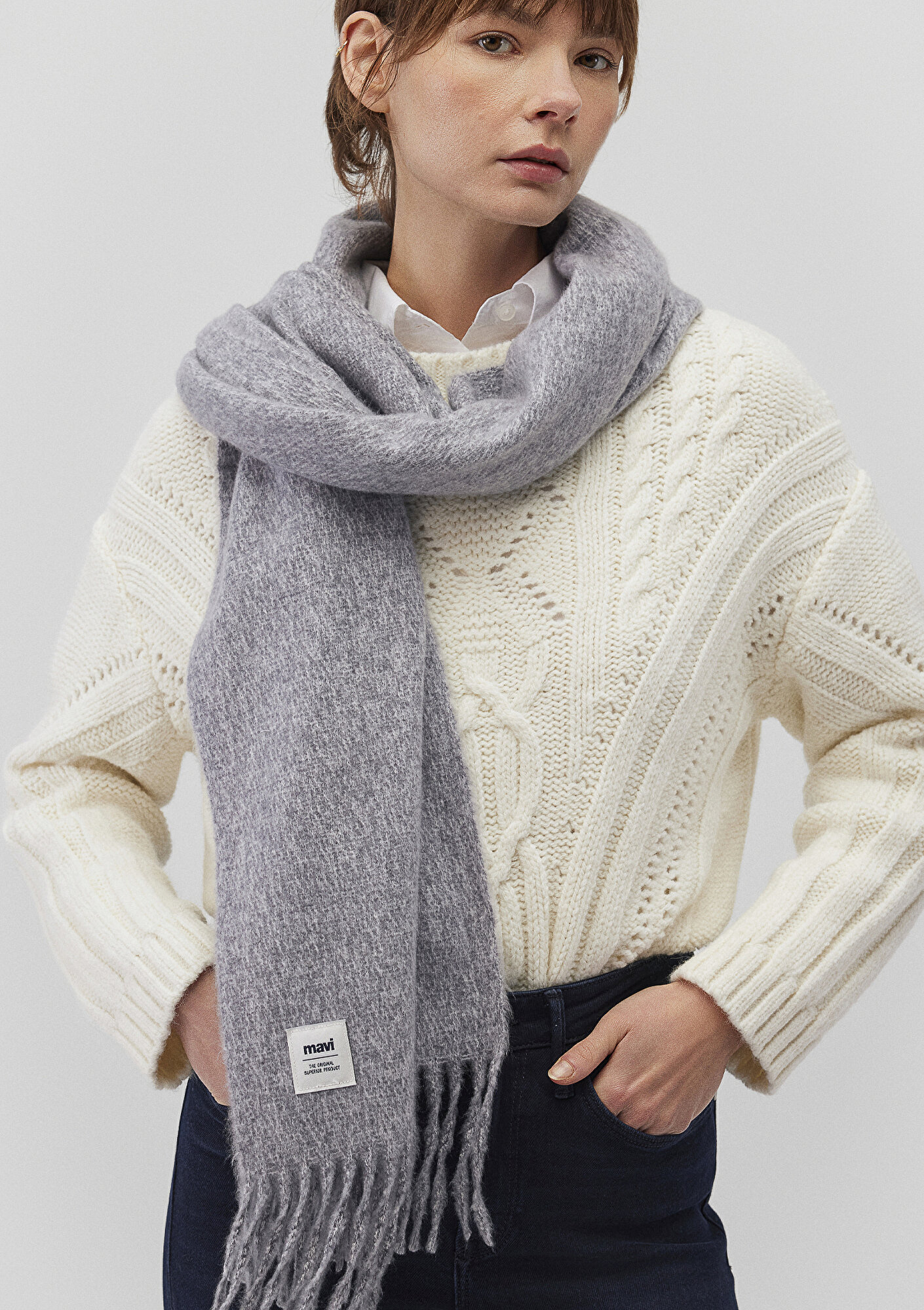 Mavi nin aksesuar koleksiyonundan Püsküllü Gri Atkı. En 50 cm x Boy 186 cm Püskül Boyu 11 cm