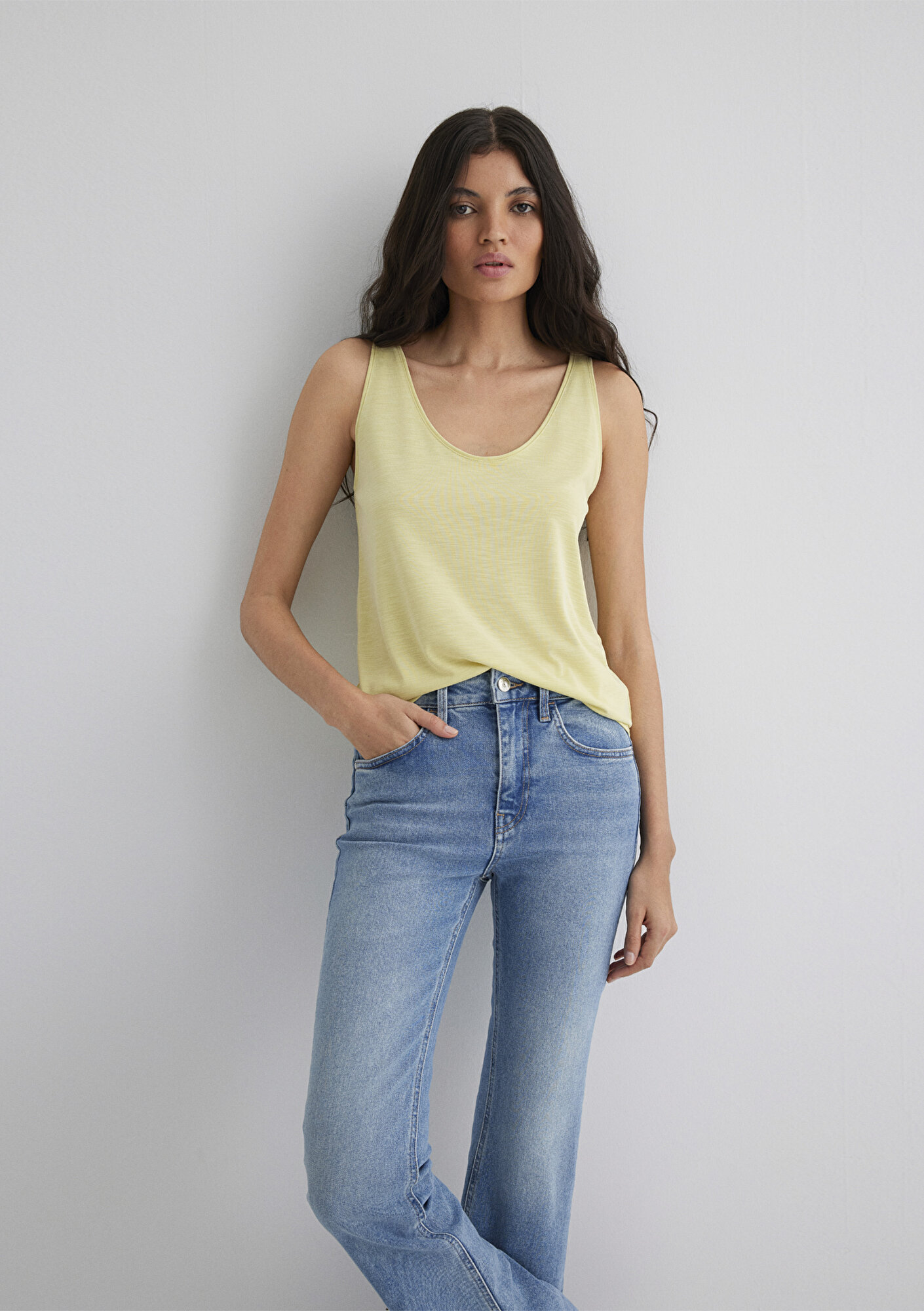 Mavi nin Lux Touch koleksiyonundan Sarı Tişört. Dokunuşu ipeğe benzeyen, yumuşak ve dökümlü formlarıyla rahatlığı ve estetiği bir araya getiren bu kumaş, giyim konforunuzu artırıyor. Yumuşak tuşelere sahip, modal iplikler ile örülen kumaşlar terletme yapmadığı için yaz aylarında da rahatlıkla kullanılabiliyor. Sık yıkanmaya rağmen rengi solmayan ve yıpranmayan bu kumaşlarla parlak bir görünüme yer açın.