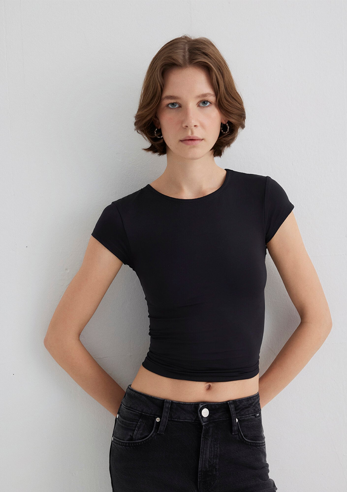 Mavi nin kadın koleksiyonundan Siyah Poliamid Tişört. Vücudu saran, bisiklet yaka, kısa kollu, poliamid basic tişört.