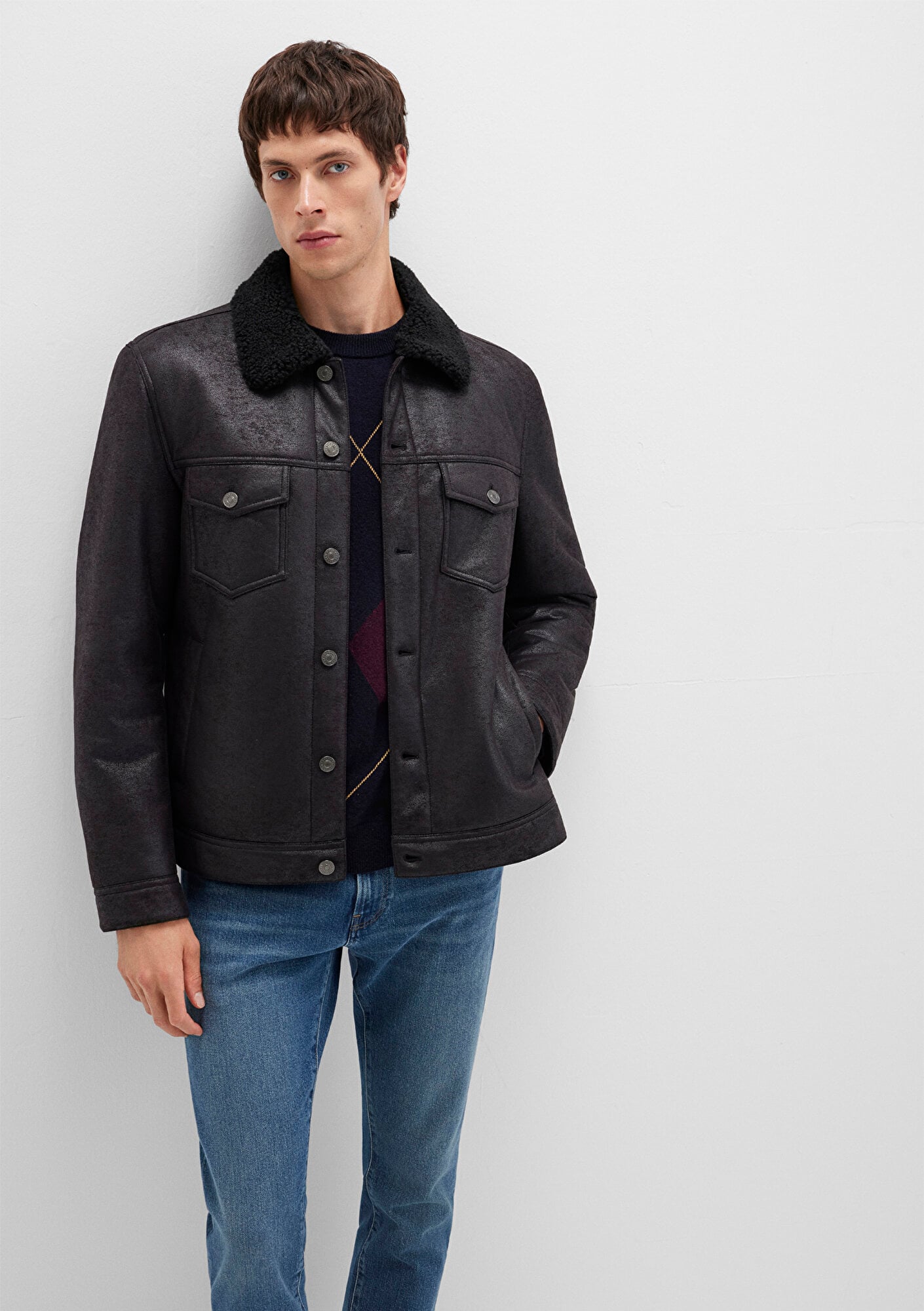 Mavi nin dış giyim koleksiyonundan Siyah Suni Deri Ceket. İki adet yan cep, iki adet düğmeli kapaklı ön cep, içi sherpa detaylı.