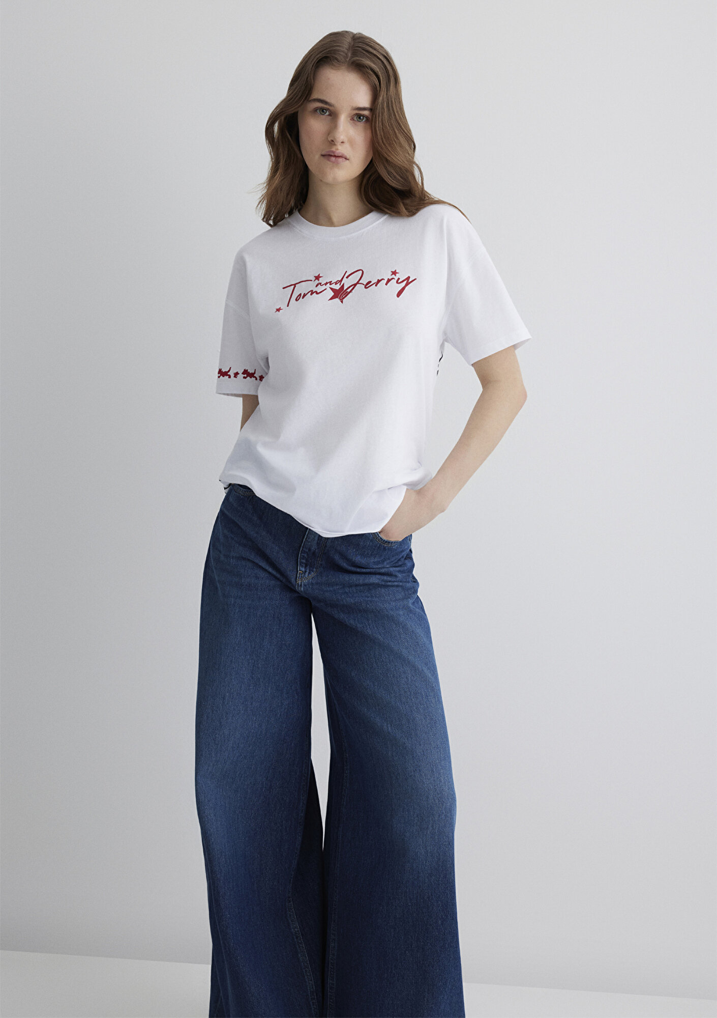 Mavi Tom and Jerry Baskılı Beyaz Tişört Loose Fit / Bol Rahat Kesim 1613359-620