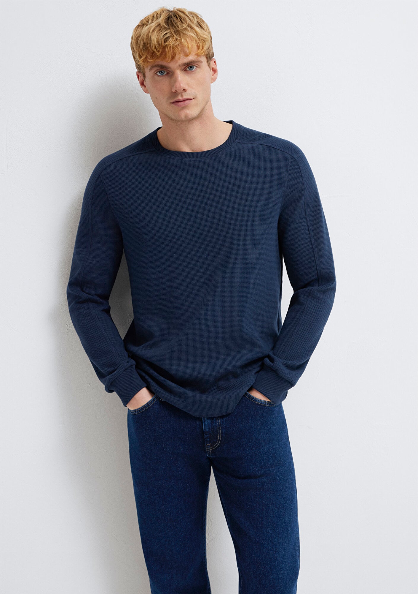 Uzun Kollu Dokulu Lacivert Basic Tişört, pamuk karışımlı orta ağırlıkta waffle kumaştan üretilmiştir. Slim fit, dar kesim özelliği ve uzun kolları ile şık bir görünüm sunarken, bisiklet yakası klasik bir tarz katar. Dokulu yüzeyi ile dikkat çeken bu tişört, günlük giyim için ideal bir seçenektir.