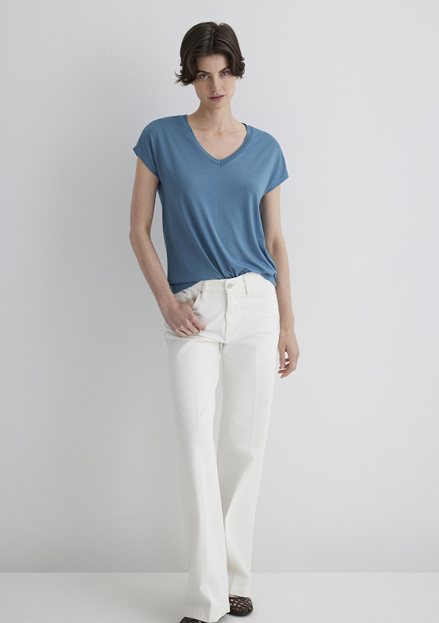 V Yaka Mavi Basic Viskoz Tişört, esnek ve orta ağırlıkta bir kumaştan üretilmiştir. V yaka tasarımı ile şık bir görünüm sunarken, kısa kollu yapısı ve düz dokusu ile sade bir stil oluşturur. Viskoz karışımlı kumaşı sayesinde yumuşak ve konforlu bir his sağlar, günlük kullanım için ideal bir seçenektir.