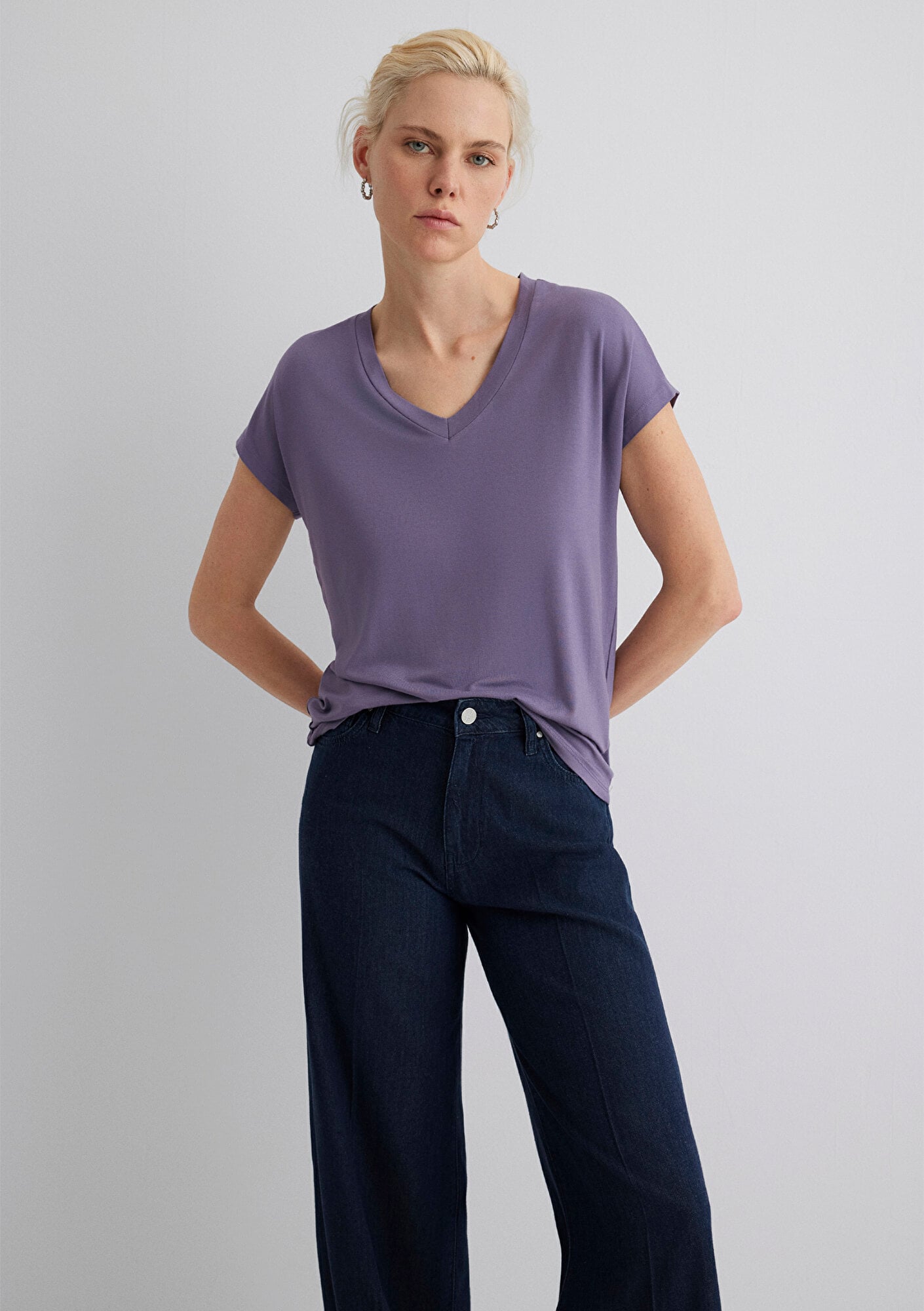 Mavi V Yaka Mor Basic Viskoz Tişört Regular Fit / Normal Kesim 167714-70608