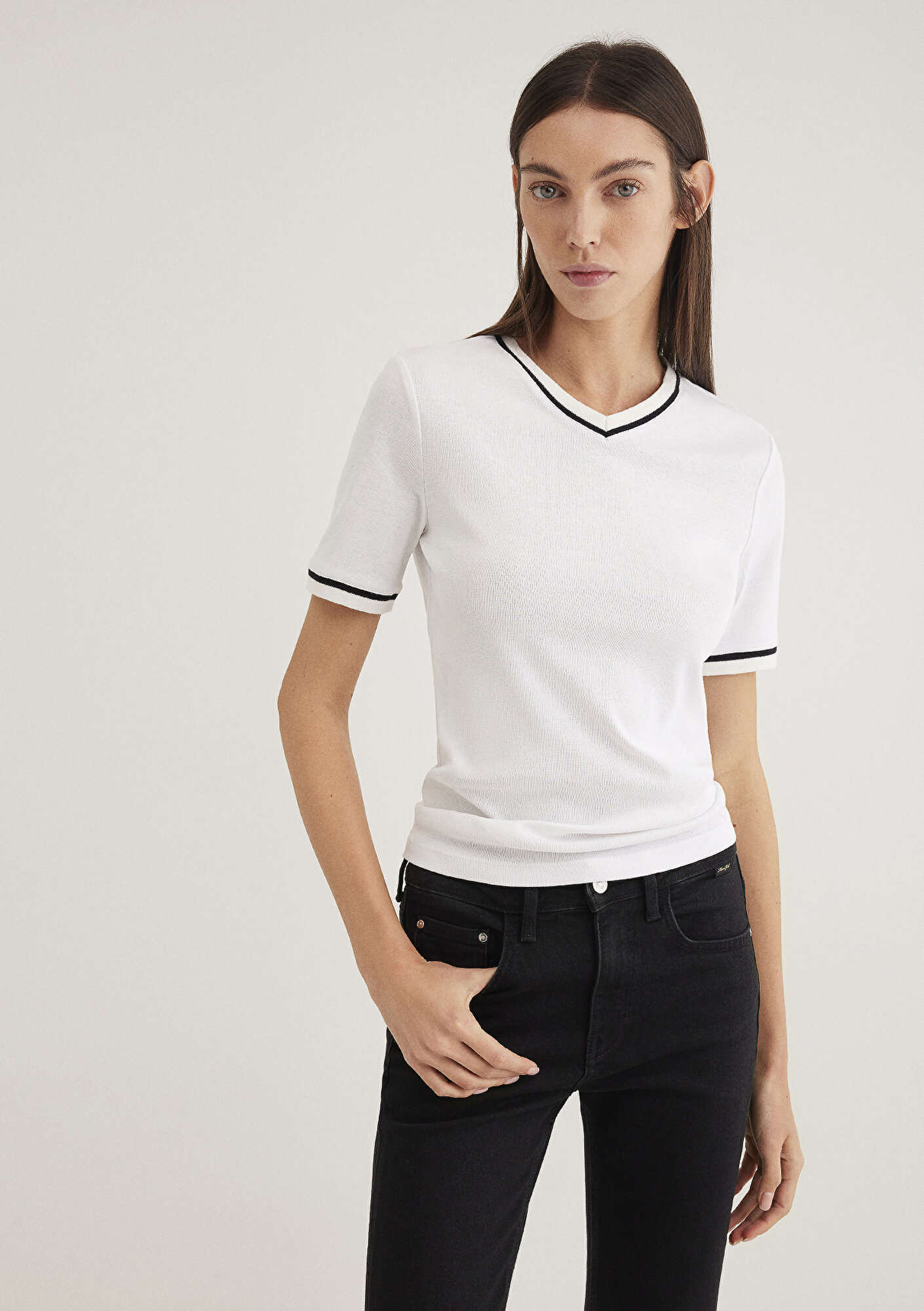 V Yaka Şerit Detaylı Beyaz Tişört, yüzde yüz pamuklu orta ağırlıkta kumaştan üretilmiştir. Slim fit, dar kesim özelliği ve V yaka tasarımı ile şık bir görünüm sunar. Kısa kollu olan bu tişört, yaka ve kol uçlarındaki siyah şerit detaylarıyla klasik beyaz tişört tasarımına modern bir dokunuş katmaktadır.