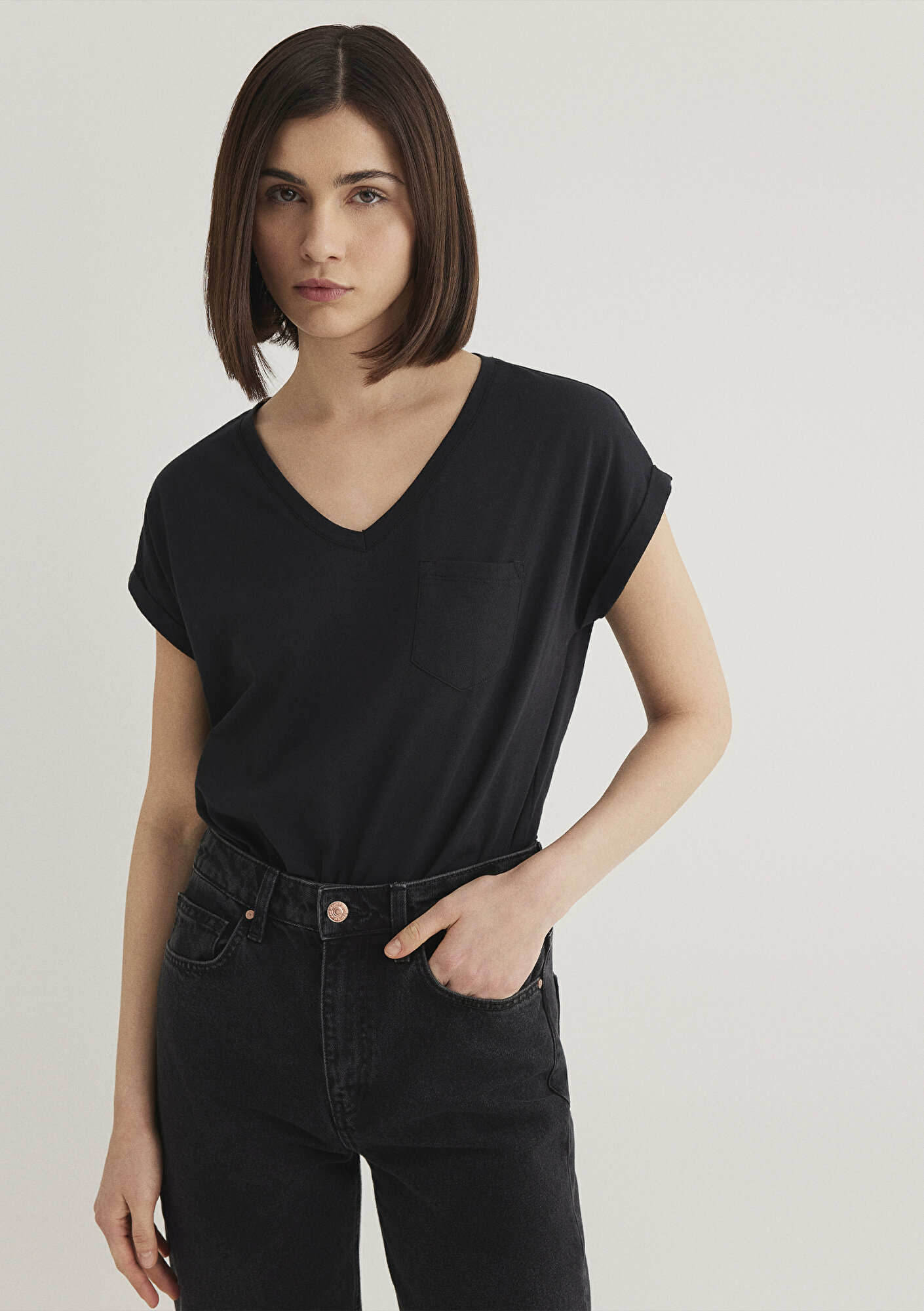 Yüzde yüz pamuk. Loose, rahat kesim. V yaka. Kısa kol. V Yaka Siyah Basic Tişört.