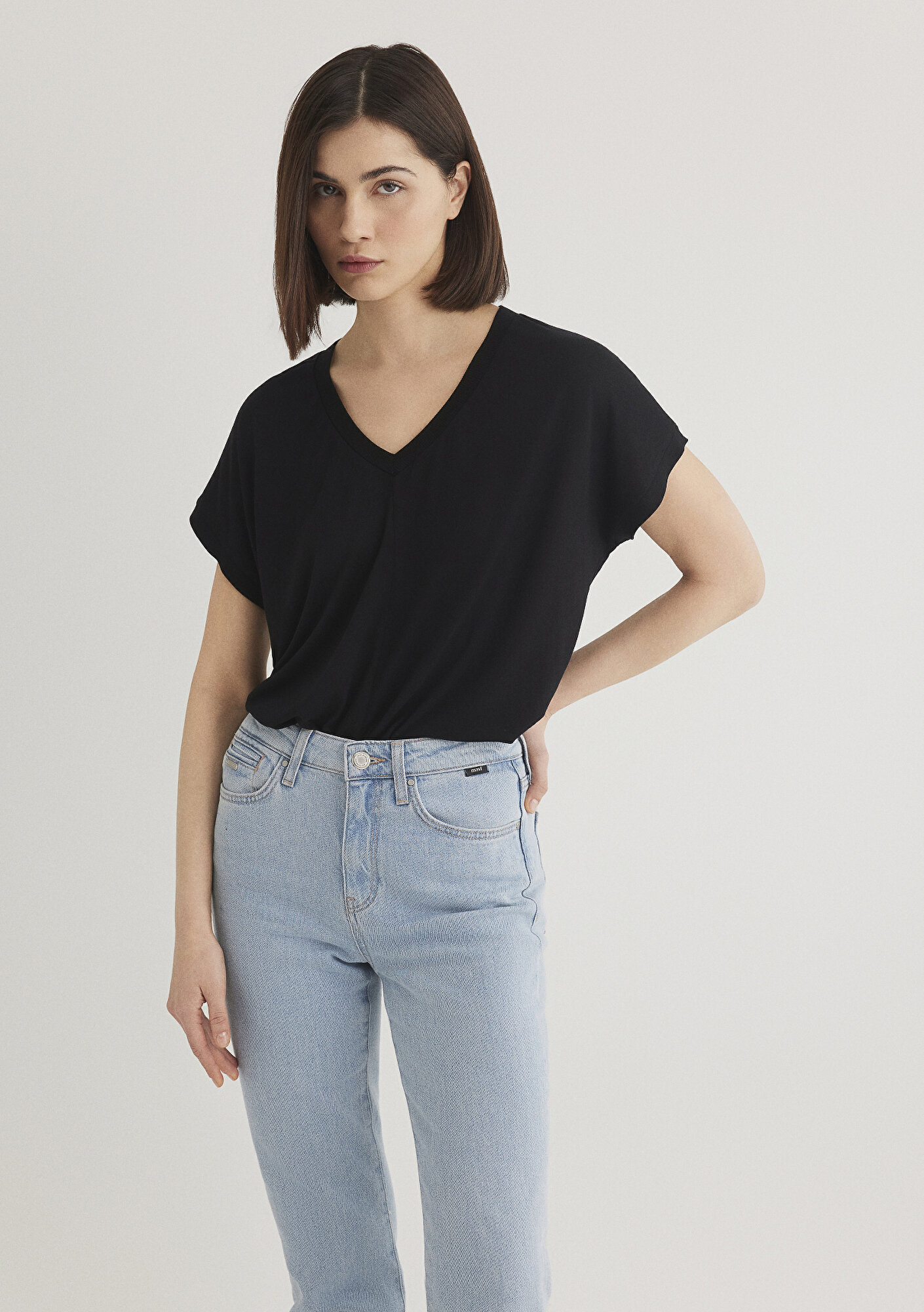 Mavi V Yaka Siyah Basic Viskoz Tişört Loose Fit / Bol Rahat Kesim 166449-900