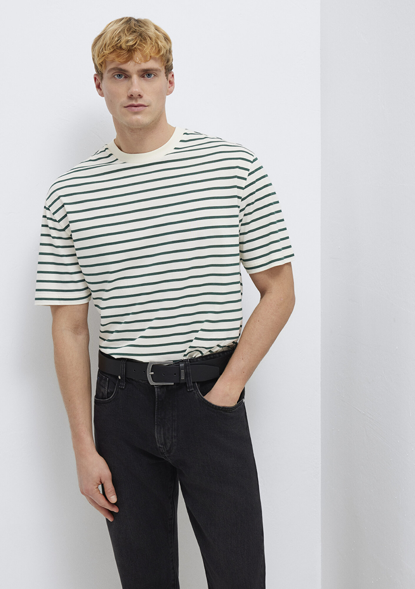 Mavi nin erkek koleksiyonundan Yeşil Çizgili Ekru Tişört.