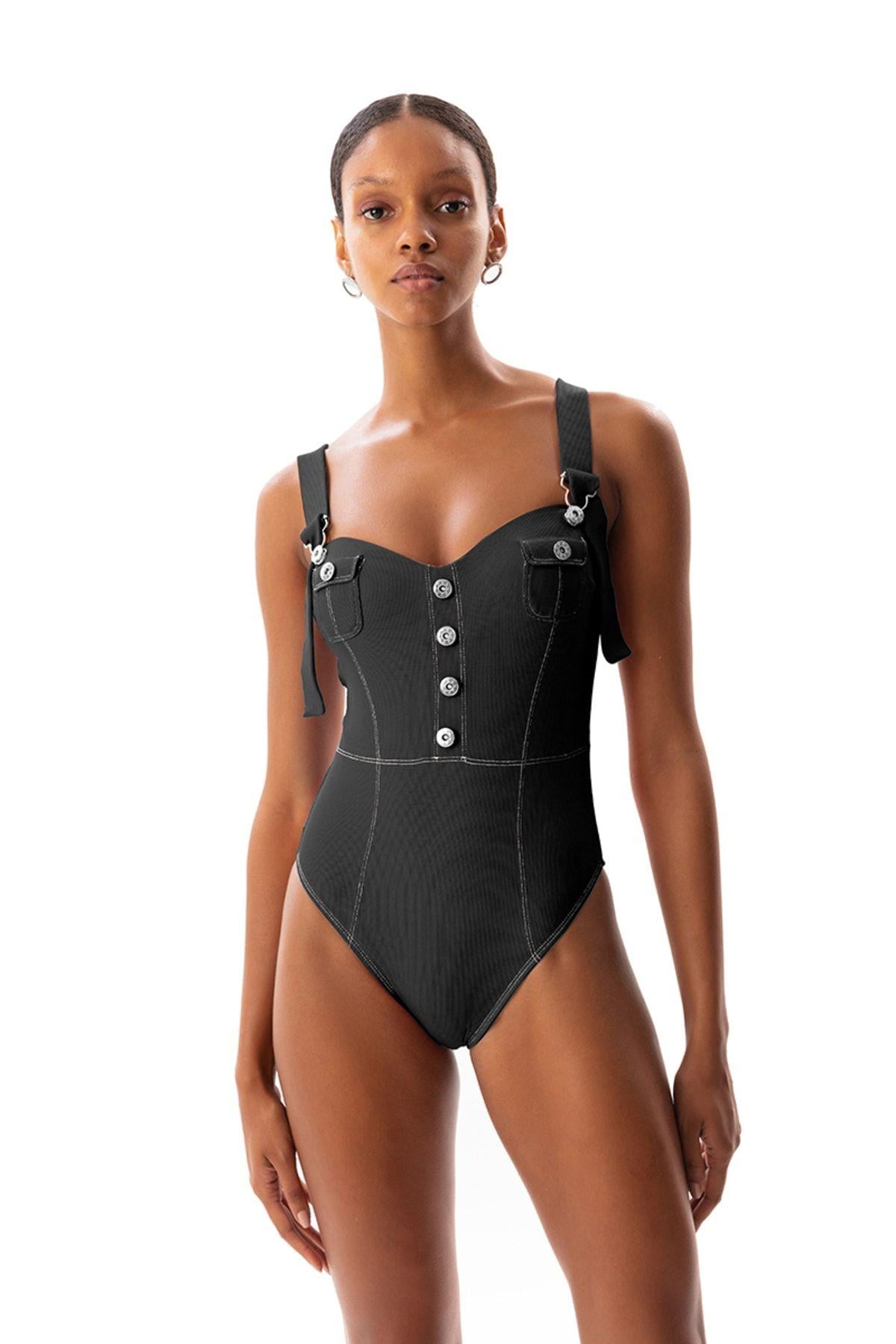 • Kalp yaka • Sabit göğüs sünger destekli • Salopet tarzı ayarlanabilir omuz askılı ve süs düğmeli • Kontrast süs dikişli • %80 Poliamid %20 Lycra® • Resimdeki mankenin giydiği ürün bedeni XS (34) bedendir • Manken ölçüleri:83/58/90