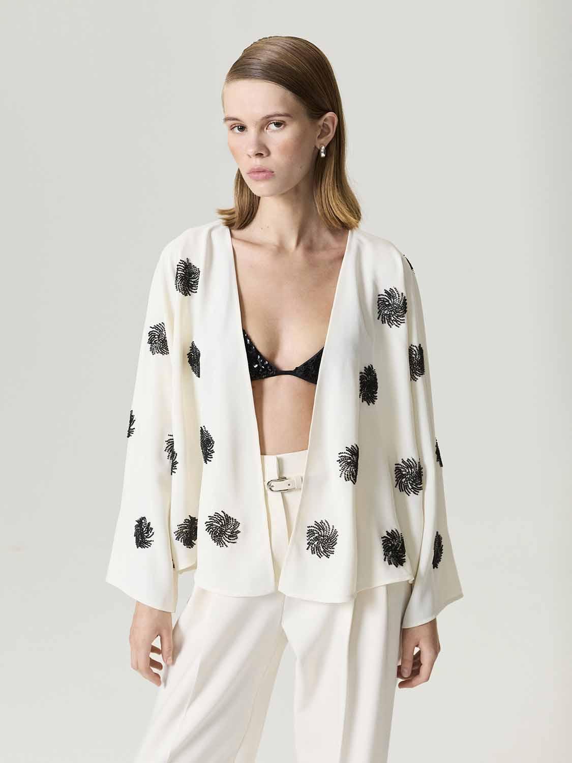 Her hareketinizde parıldayan karmaşık boncuk motifleriyle bezeli bu rahat kesim kimono ile unutulmaz bir giriş yapın. Geniş, uçuşan kimono kolları ve açık ön kısmıyla tasarlanan dökümlü silüet, zahmetsiz bir şıklık sunar. Hafif krep kumaştan üretilen ve maksimum hareket özgürlüğü için astarsız bırakılan bu parça, akşam şıklığı veya şık gündüz görünümleri için en üst düzey katmanlı parçadır. Kalıp: Relaxed Fit Beden Önerisi: Rahat bir görünüm için normal bedeninizi veya daha dar bir kesim için bir beden küçük almanızı öneririz. Model Ürün Bedeni: S Model Bedeni: Boy: 1.77cm, Göğüs: 84cm, Bel: 57cm, Basen: 87cm