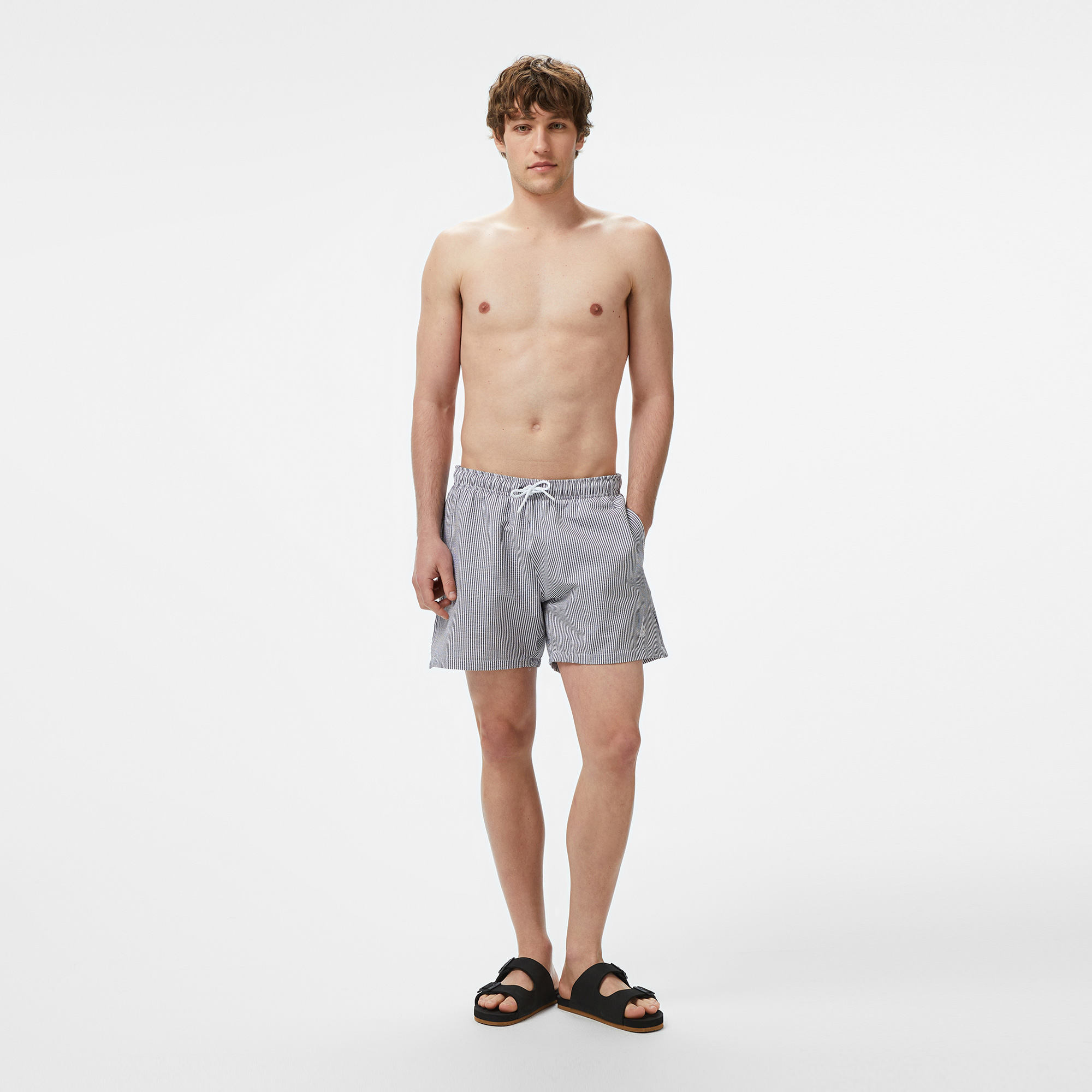 Nautica Erkek Lacivert Çizgili Deniz Şortu, lacivert rengi ve tarz çizgili tasarımıyla plajda veya havuzda rahatça kullanabileceğiniz bir şorttur.