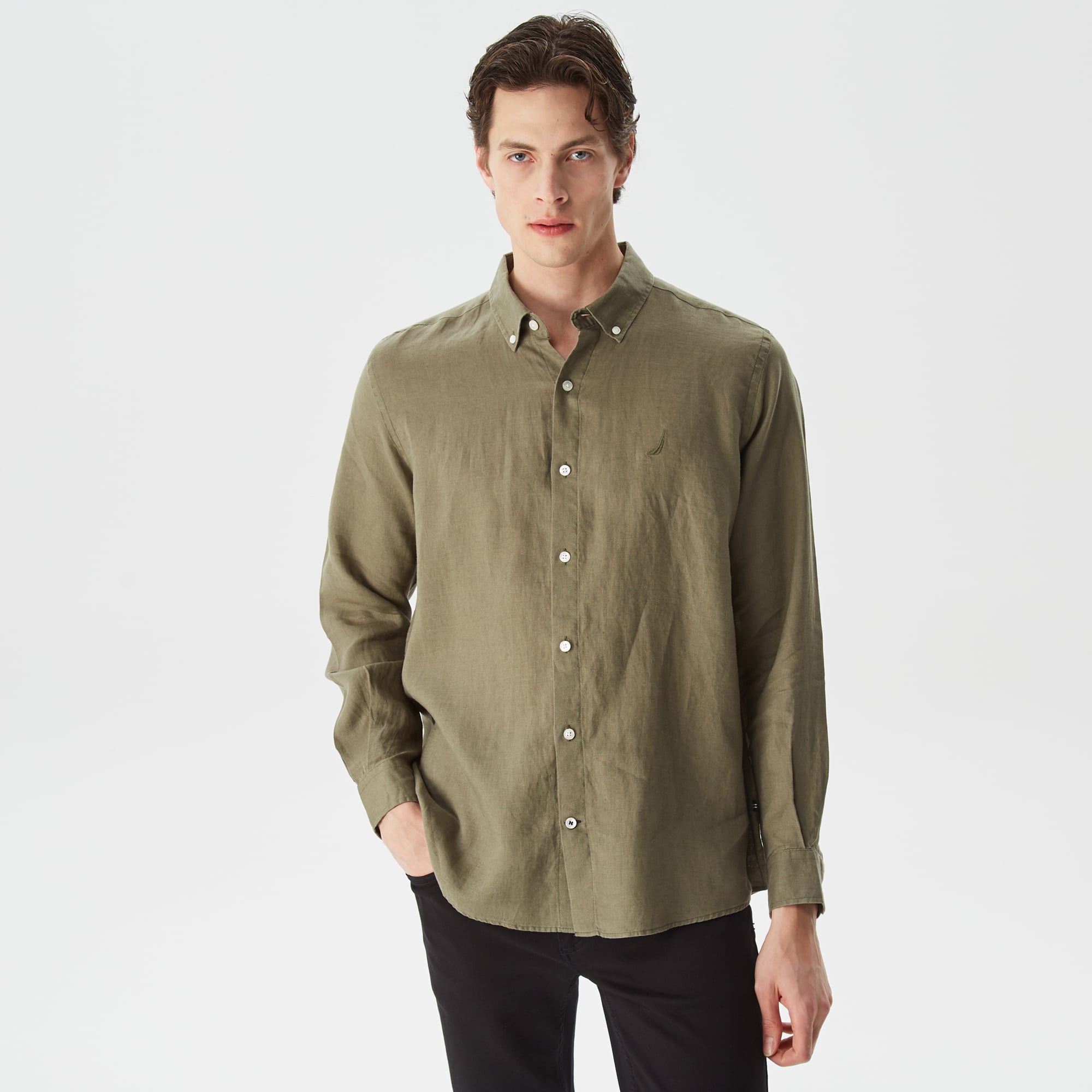 Nautica Erkek Yeşil Classic Fit Uzun Kollu Keten Gömlek
