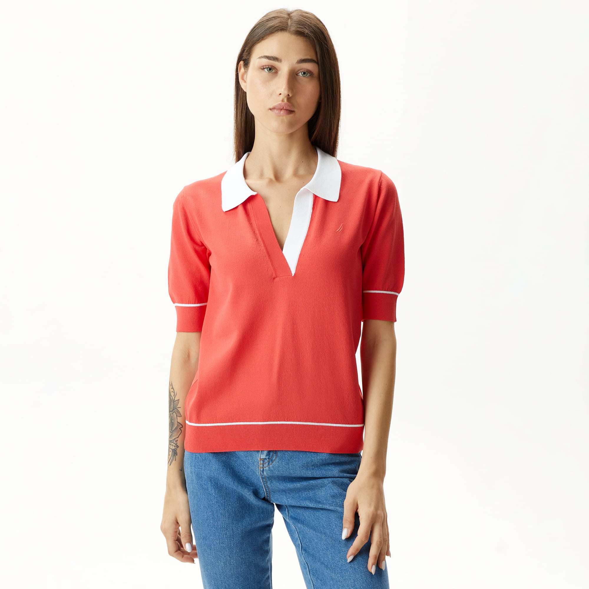 Nautica Kadın Kırmızı Relaxed Fit Kısa Kollu Triko