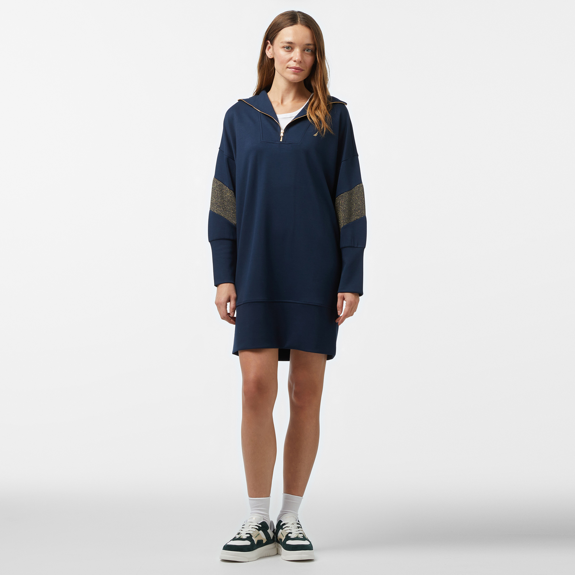 Nautica'nın yenilikçi tasarımıyla dikkat çeken elbise, dik yaka ve yarım fermuar detaylarıyla modern bir görünüm sunuyor. Kollarındaki gold sim detayları, zarif bir parıltı katarken, göğüs kısmındaki Nautica logosu sofistike bir dokunuş ekliyor. Farklı renk seçenekleriyle, bu elbise her tarza ve her ruh haline uyum sağlarken tarzınızı ve şıklığınızı bu elbiseyle her zaman bir üst seviyeye taşıyacaksınız!