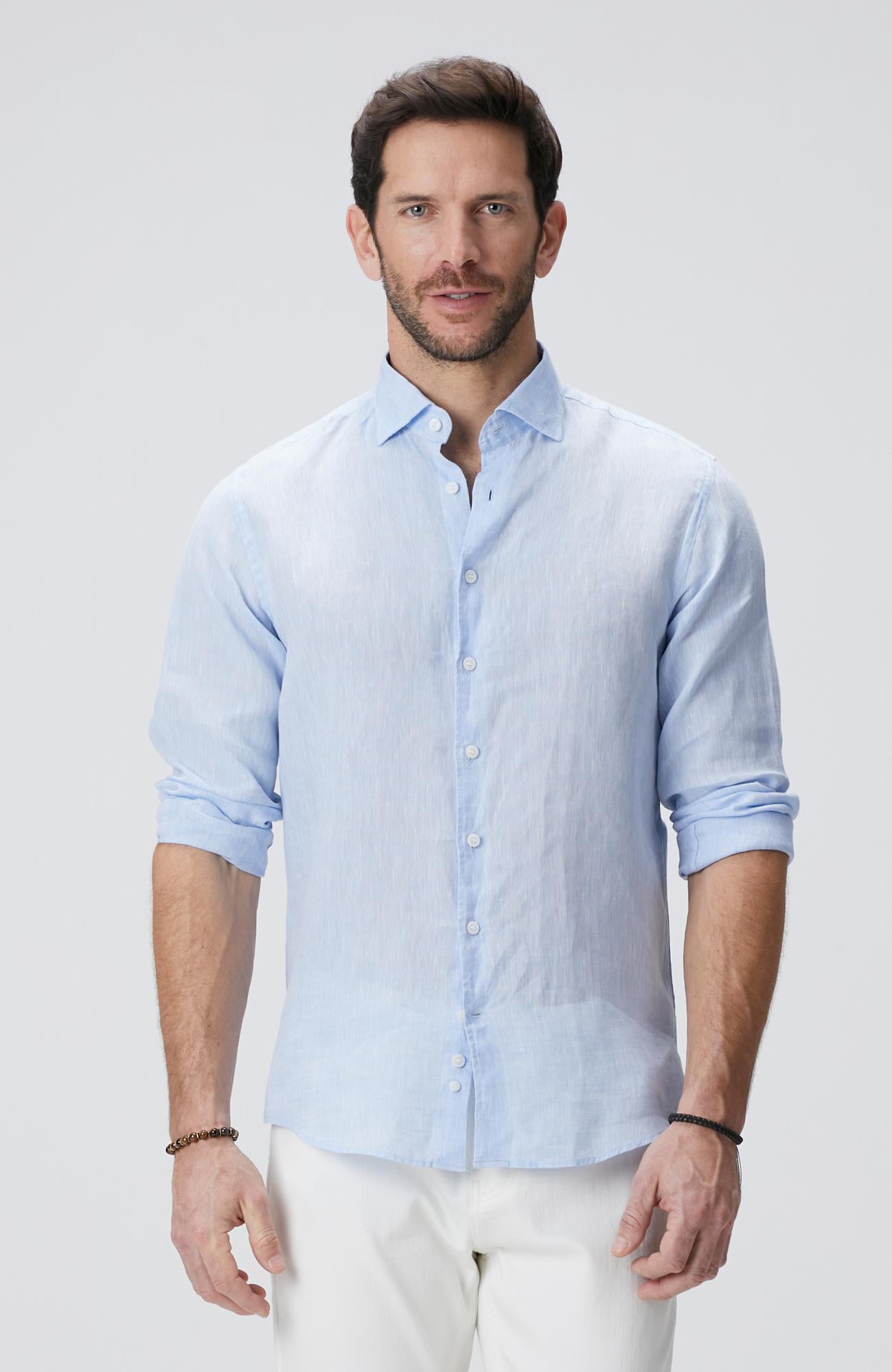 %100 Keten;Slim Fit; Alttan Britli Yaka; Uzun Kol; Dokuma; Keten Gömlek; Düz Renk; Cepsiz; Beachwear;