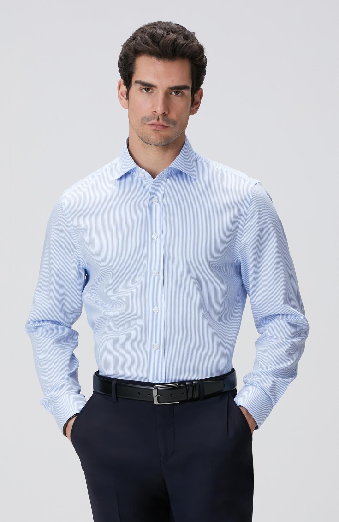 %100 Pamuk;Slim Fit; Yarım İtalyan Yaka; Uzun Kol Gömlek; Çizgi Desenli; Cepsiz; Non-Iron;