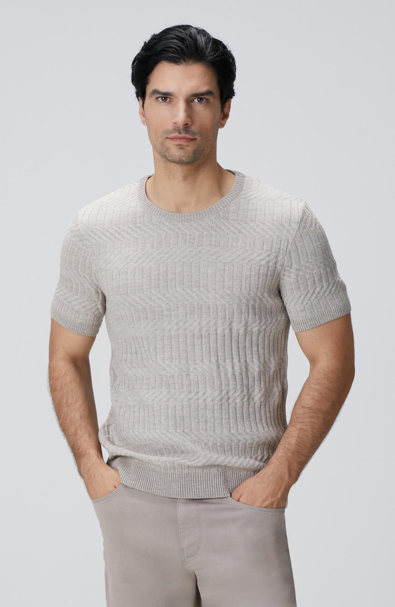 Açıklama : %34 Yün;%33 Akrilik;%33 Polyester;Slim Fit; Bisiklet Yaka; Yün Karışımlı Triko Kazak; Balıksırtı Desenli; Kısa Kol