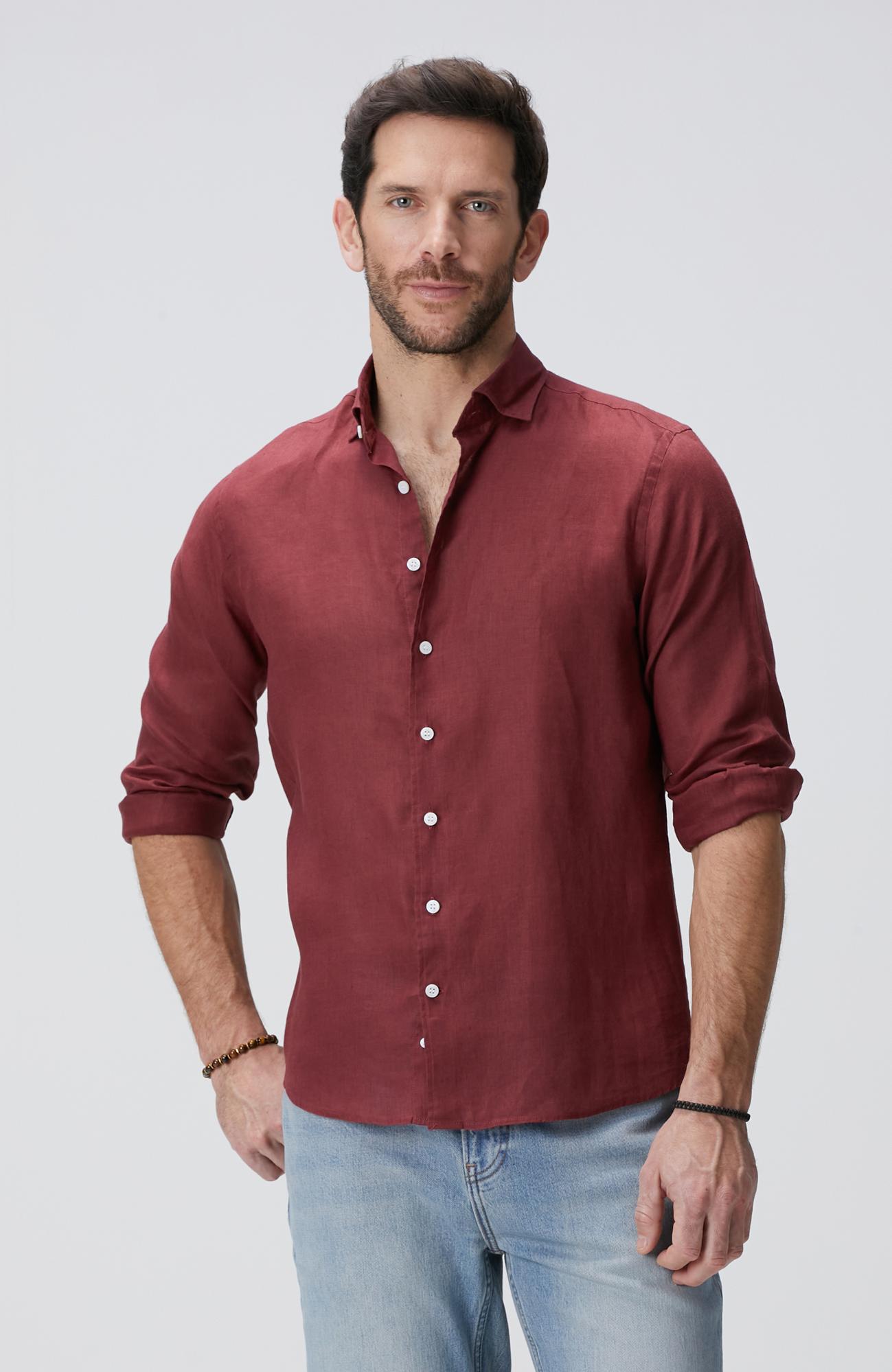 %100 Keten;Slim Fit; Alttan Britli Yaka; Uzun Kol; Dokuma; Keten Gömlek; Düz Renk; Cepsiz; Beachwear;