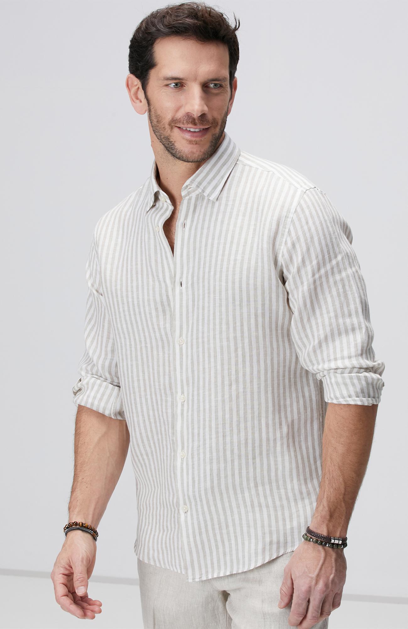 • Açıklama : %100 Keten;Slim Fit; Alttan Britli Yaka; Düğme Kapatmalı; Çizgili; Keten Gömlek