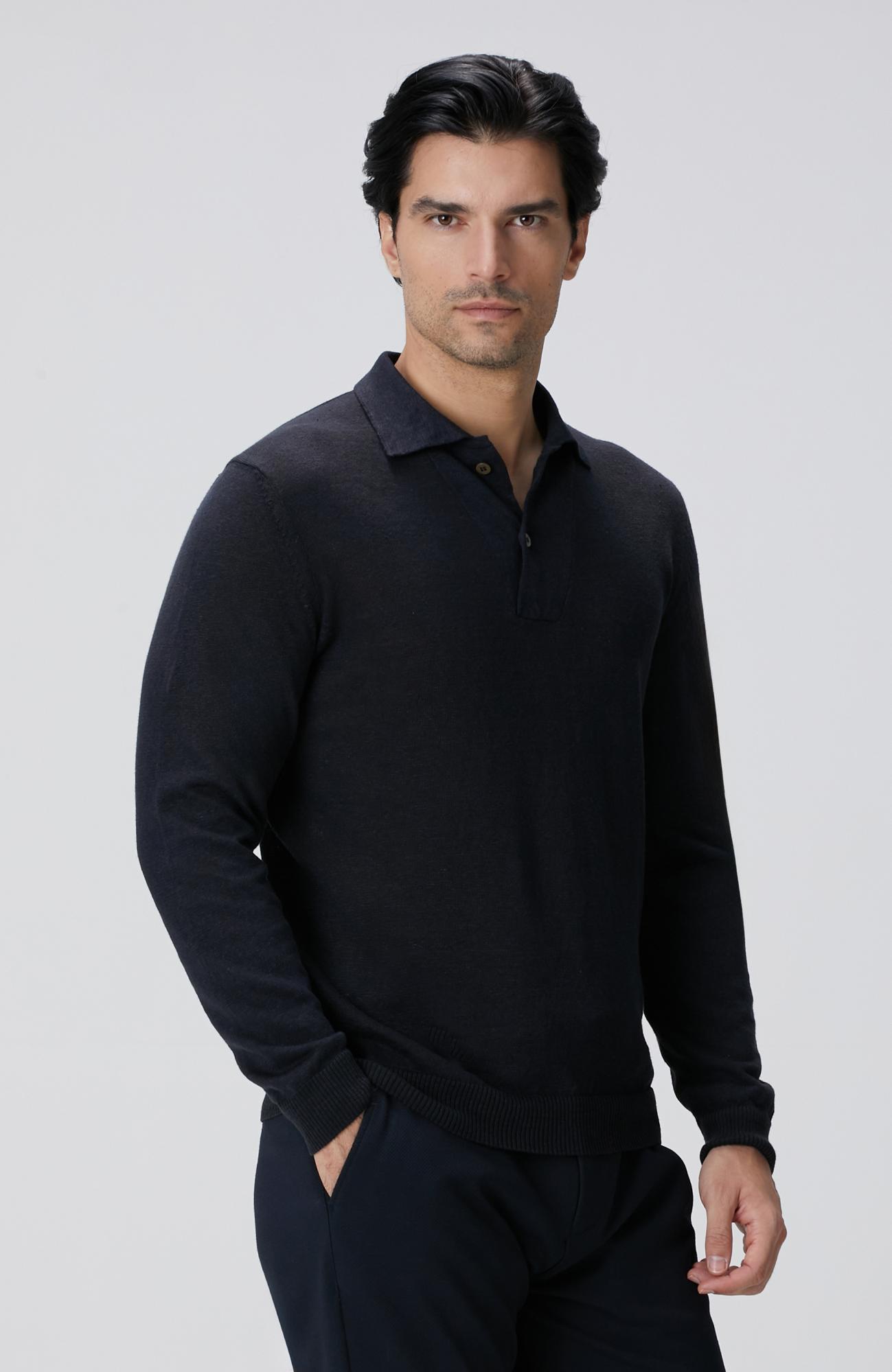 Network Erkek Lacivert Polo Yaka Keten Karışımlı Triko Kazak