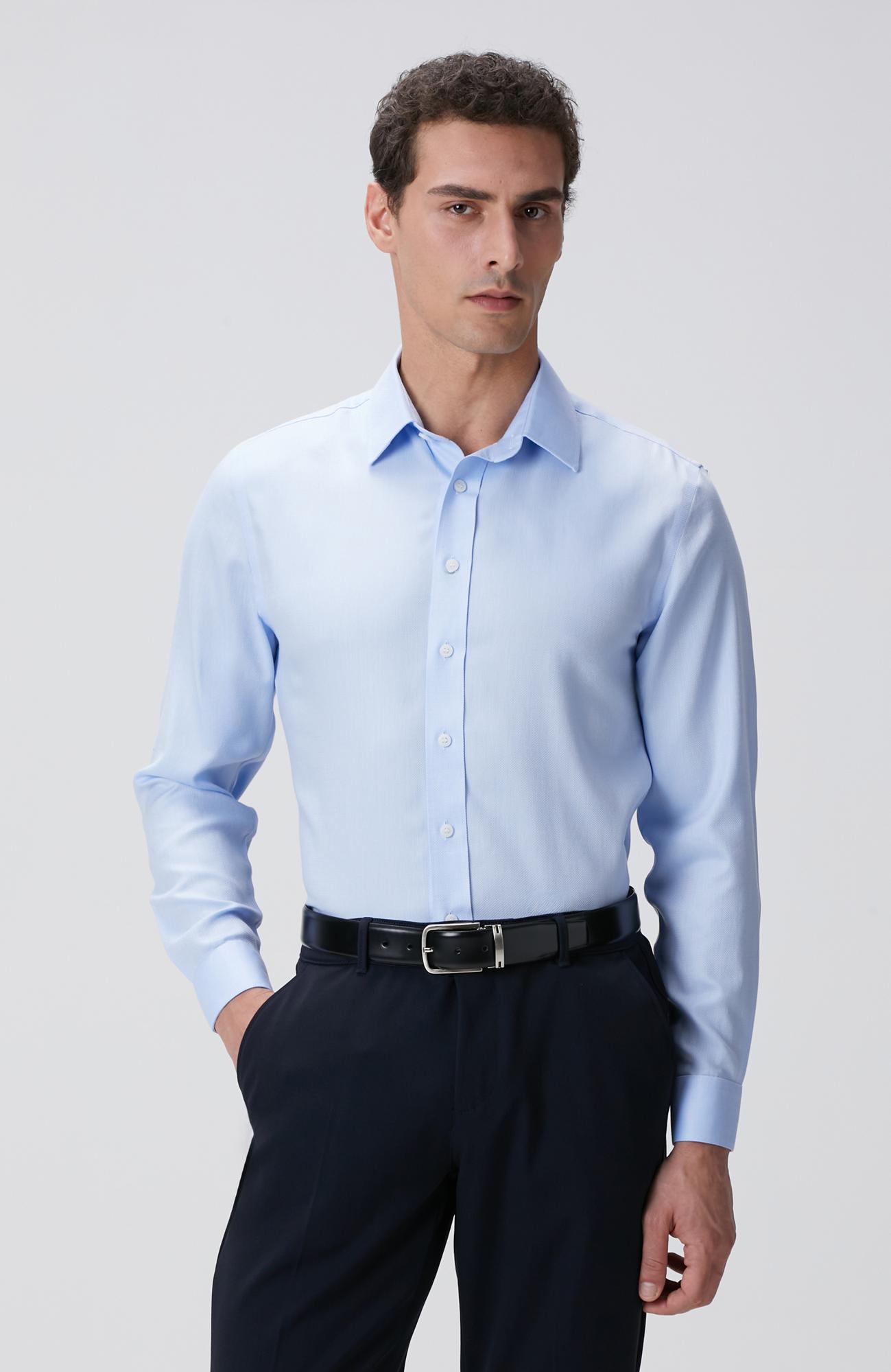 %100 Pamuk;Slim Fit; Balenli Klasik Yaka; Uzun Kol; Dokuma Gömlek; Balıksırtı Desenli; Cepsiz; Non-İron;