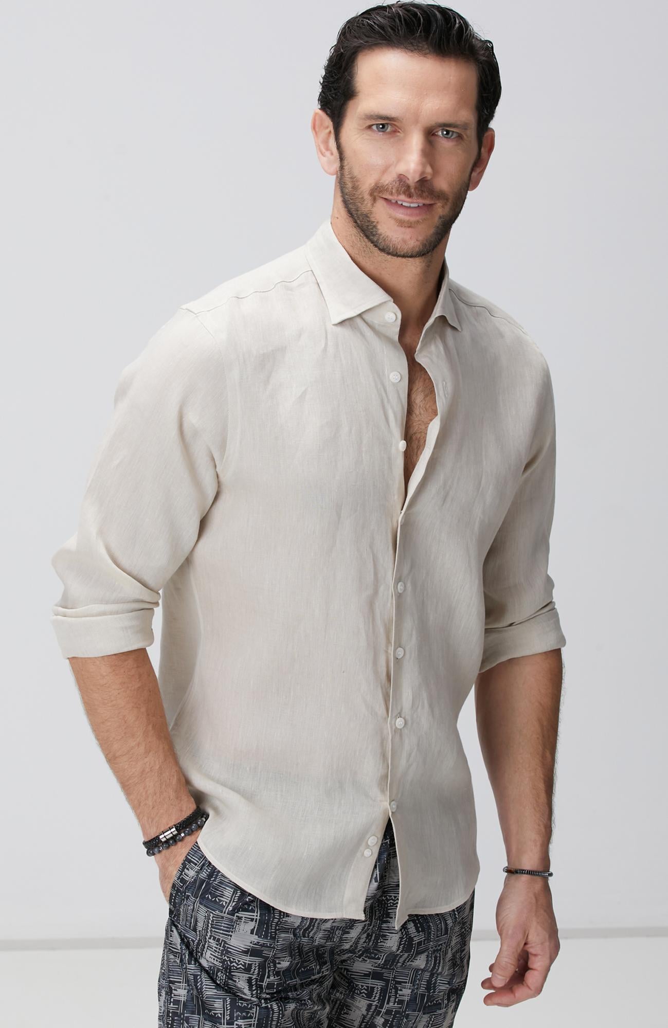 %100 Keten;Slim Fit; Alttan Britli Yaka; Cepsiz; Keten Gömlek;