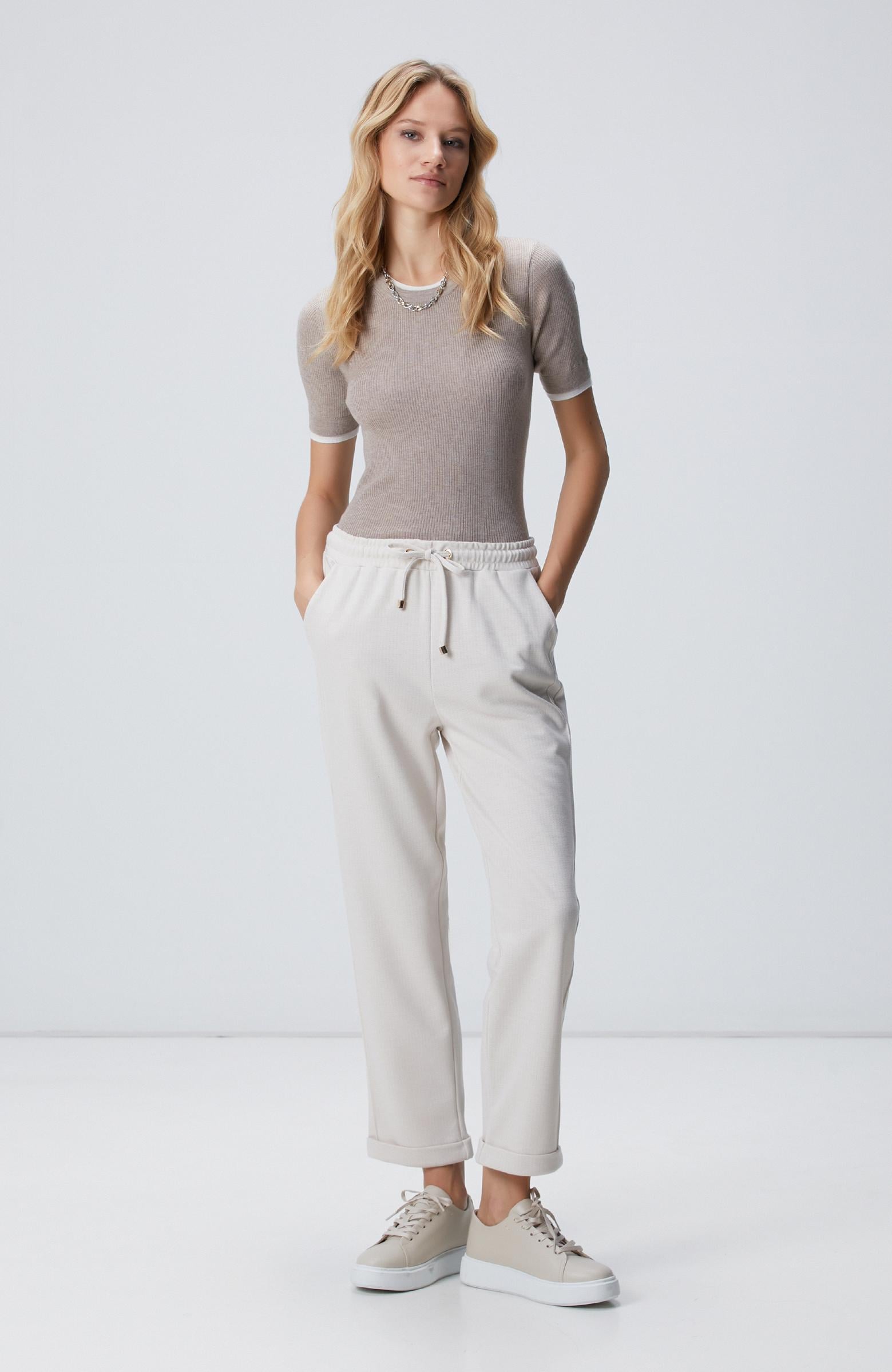 Açıklama : %65 Polyester;%28 Viscose;%7 Elastan;Basic Fit; Lastikli Orta Bel; Duble Paça; Örme Pantolon; Desenli; Yandan Dikiş Detaylı; Cepli