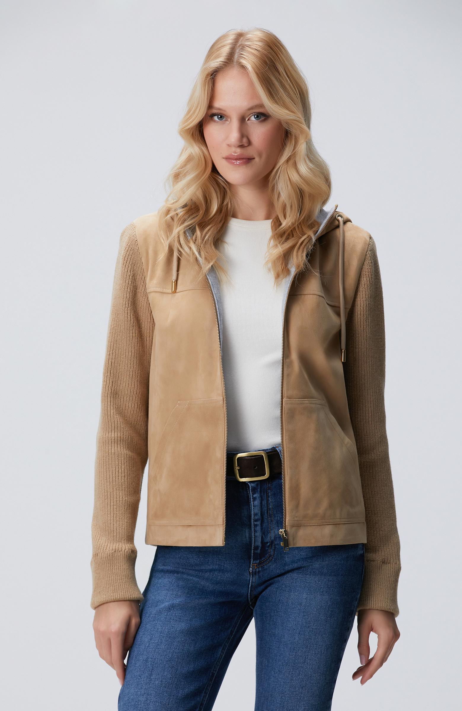 Network Kadın Bej Kapüşonlu Triko Detaylı Süet Deri Mont