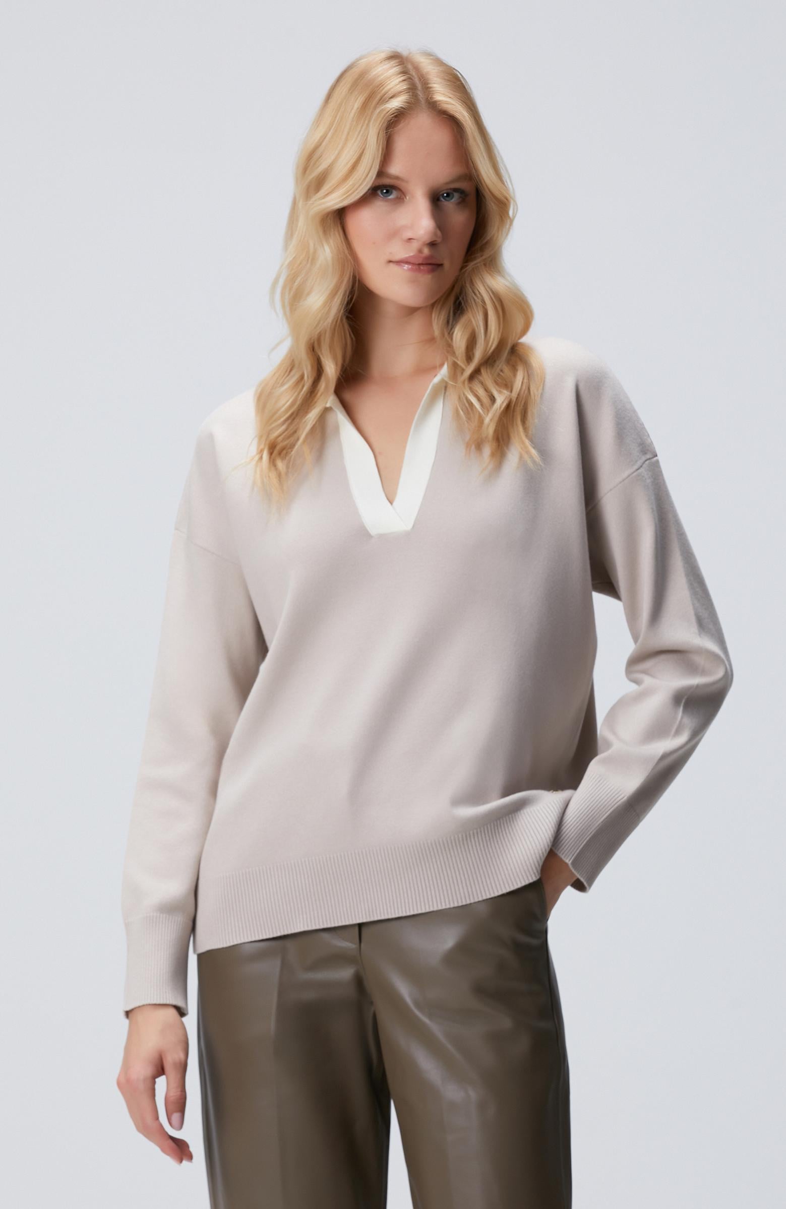 Açıklama : %57 Viscose;%30 Polyester;%13 Polyamid;Regular Fit; Polo Yaka; Uzun Kol; Triko Kazak