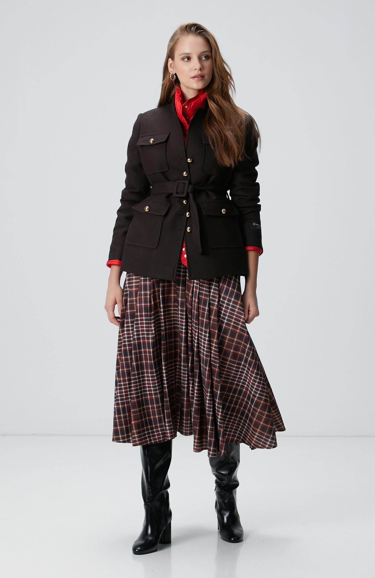 Network Kadın Camel Ekose Desenli Piliseli Midi Tafta Etek