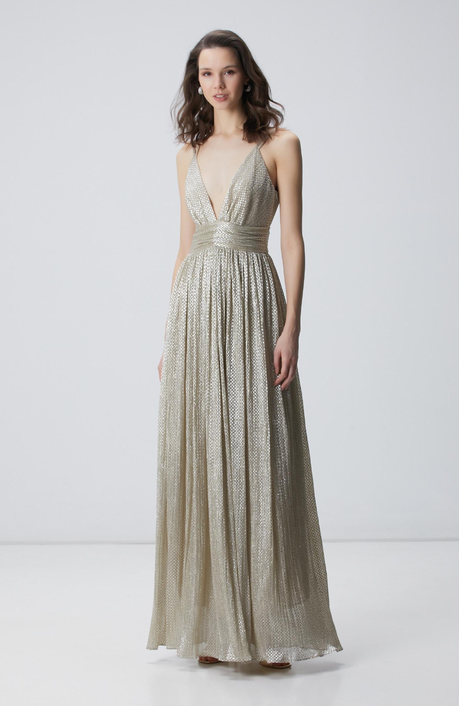 Açıklama : %55 Polyester;%45 Polyamid;Regular Fit; V Yaka; Askılı; Varaklı; Dokuma; Maxi Abiye Elbise; Yüksek Bel; Cepsiz