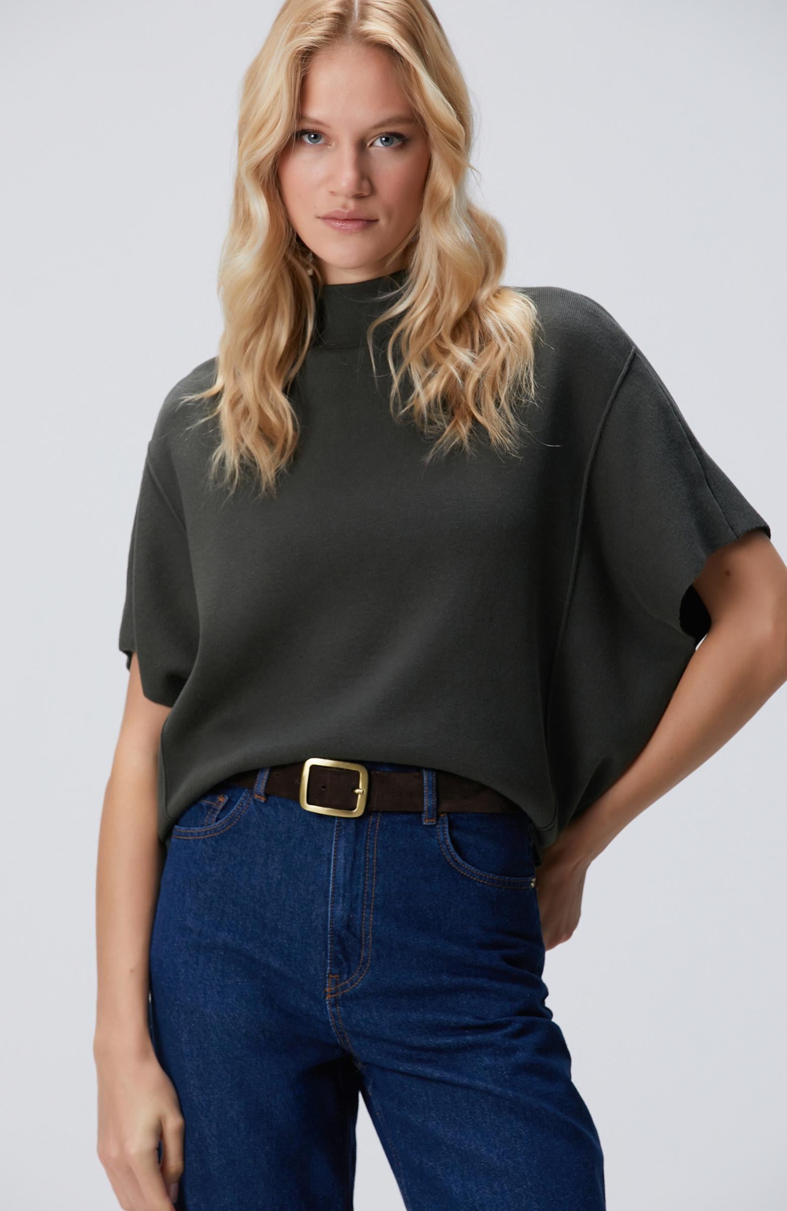 Network Kadın Haki Dik Yaka Kısa Kollu Nervür Detaylı Kazak