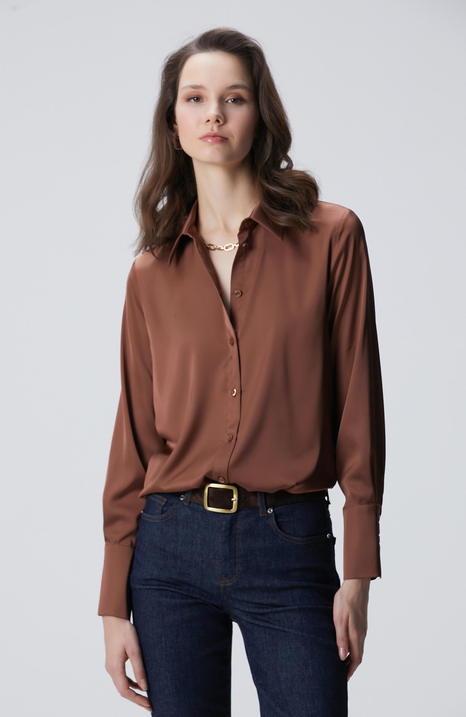 Network Kadın Kahverengi Geniş Manşetli Saten Gömlek