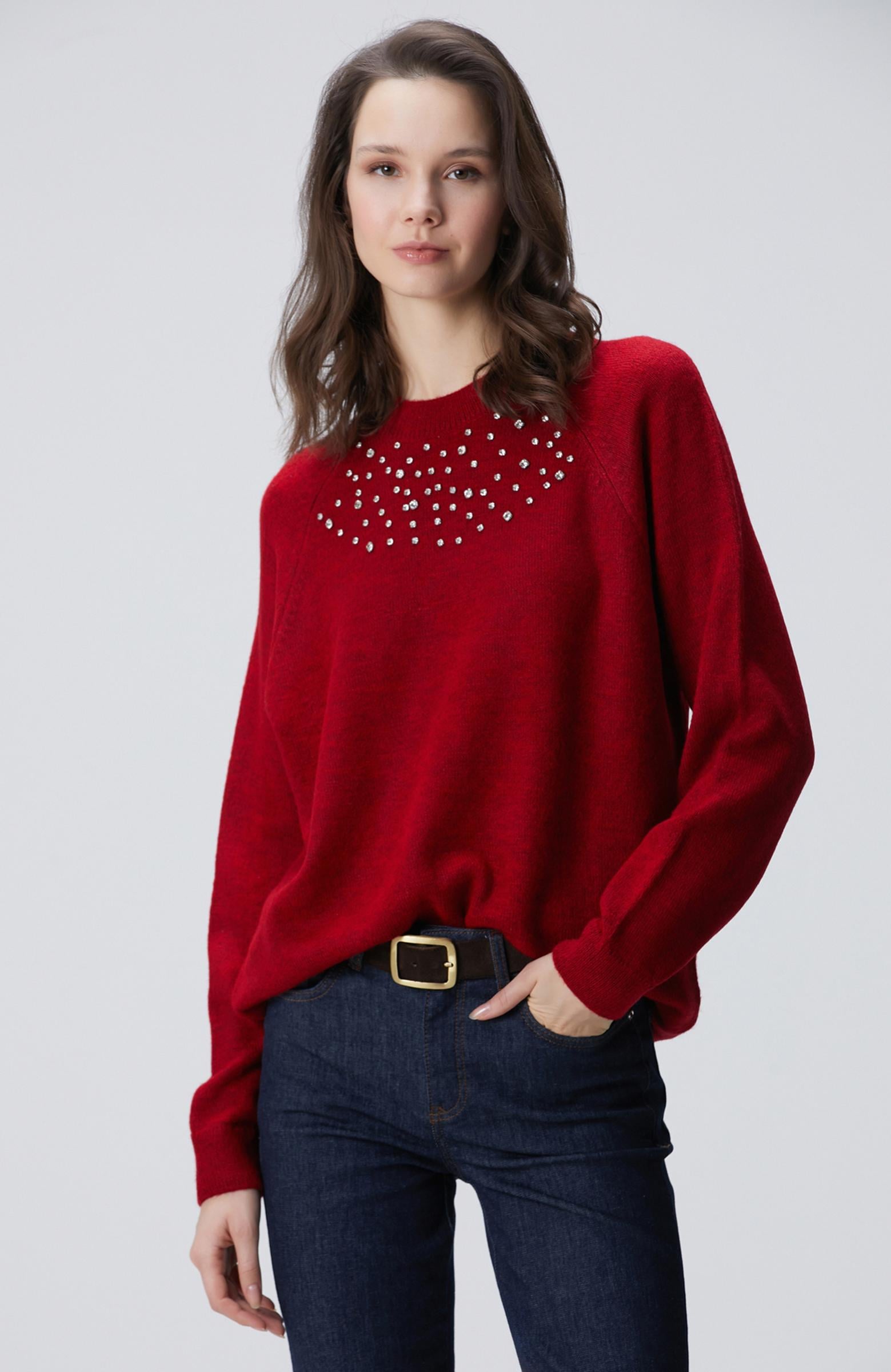 Network Kadın Kırmızı Bisiklet Yaka Taş İşlemeli Kazak