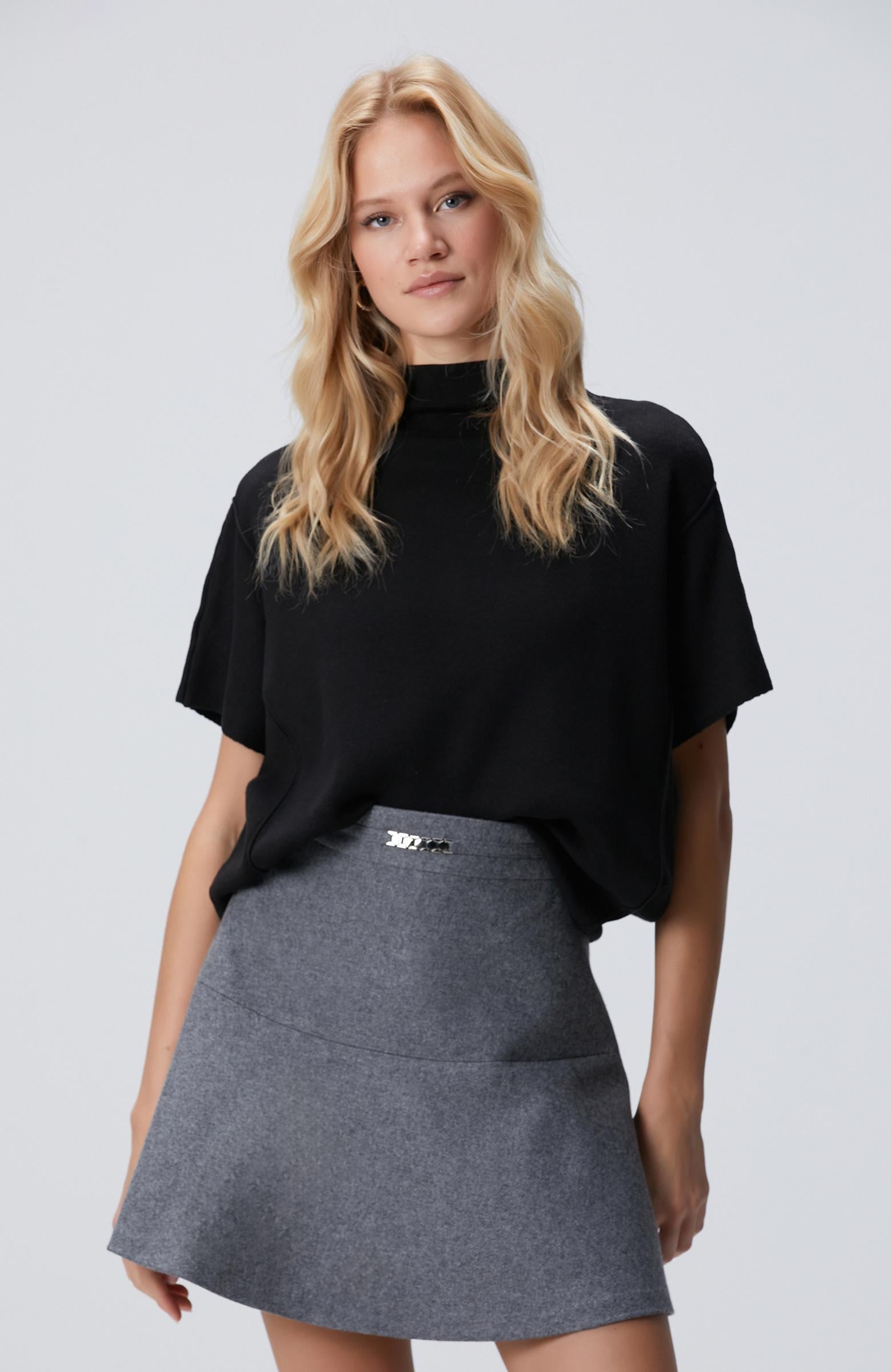 Network Kadın Siyah Dik Yaka Kısa Kollu Nervür Detaylı Kazak