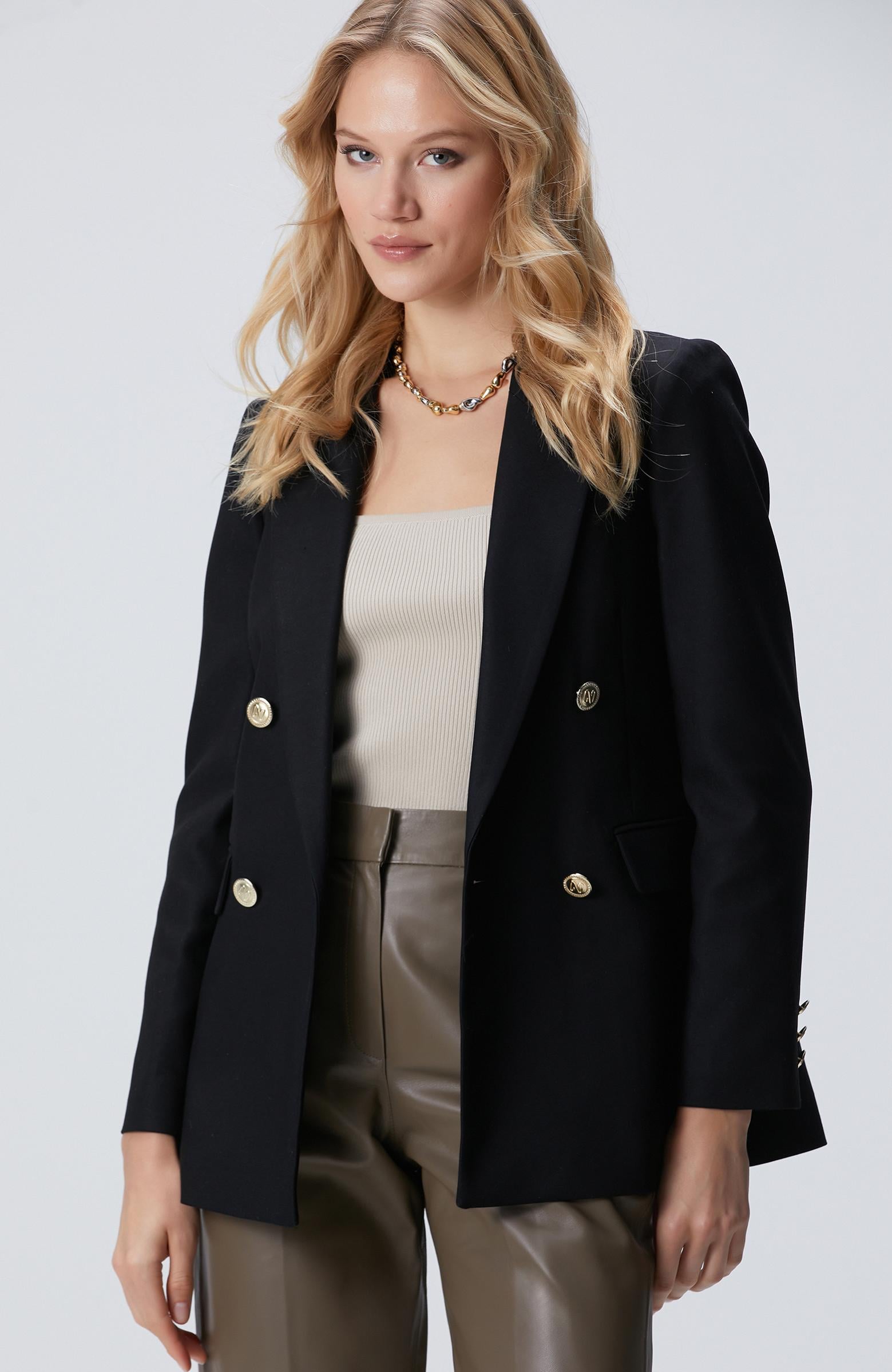Network Kadın Siyah N Logolu Metal Düğmeli Kruvaze Ceket