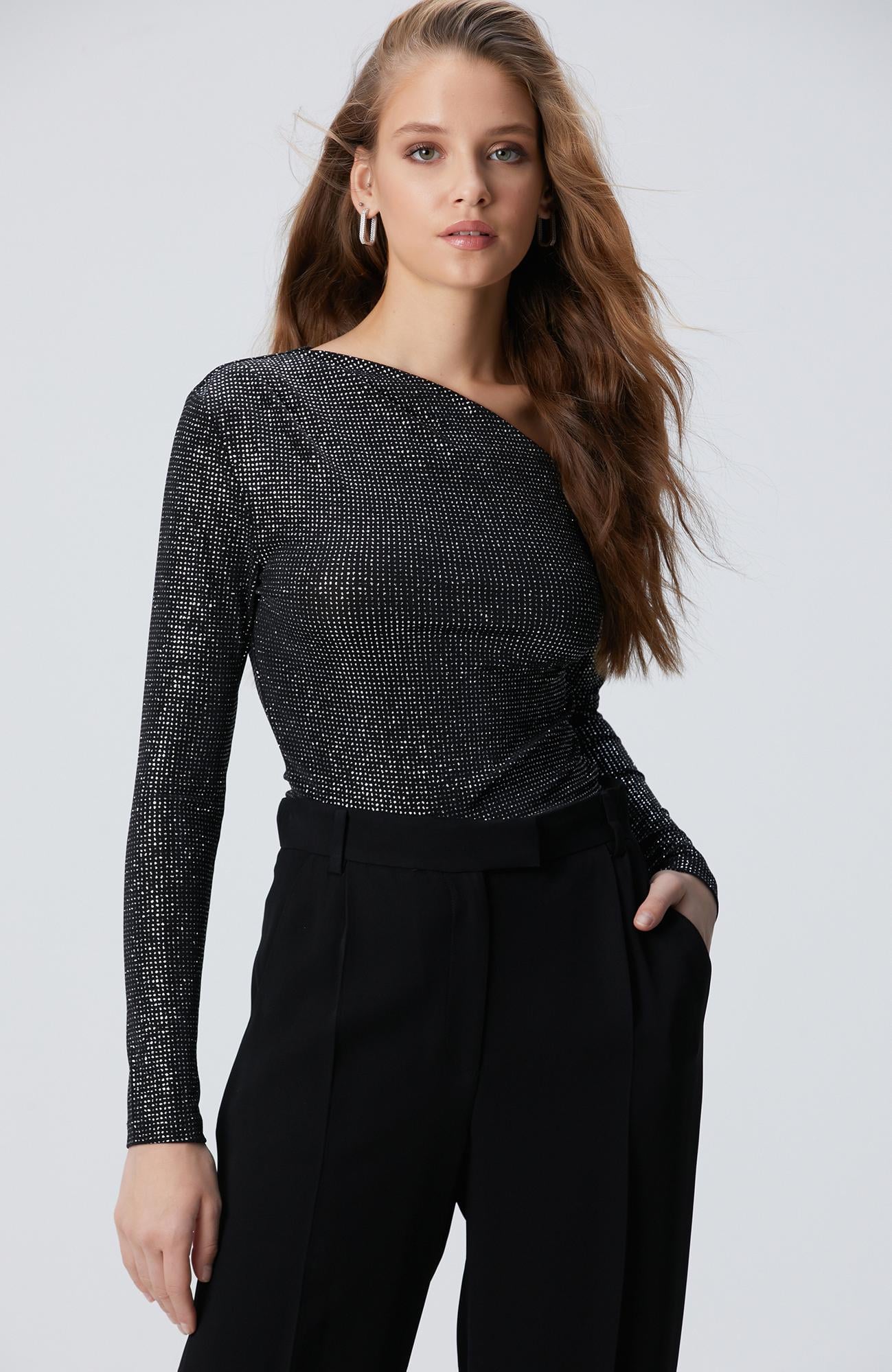 Açıklama : %95 Polyester;%5 Elastan;Slim Fit; Tek Omuz Yaka; Uzun Kol; Cepsiz; Simli Örme Bluz