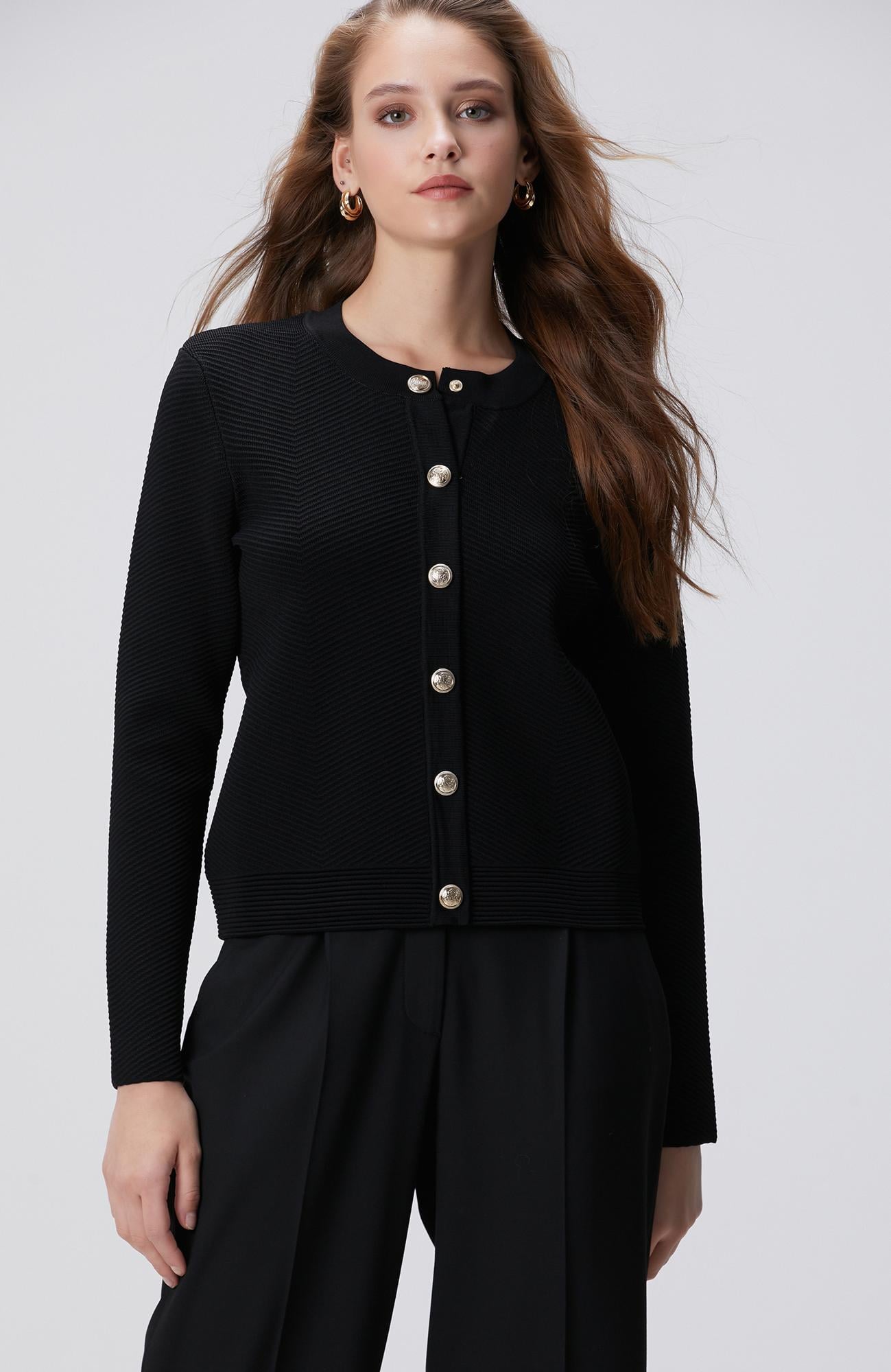 Açıklama : %65 Viscose;%35 Polyamid;Regular Fit; Bisiklet Yaka; Uzun Kol; Triko Ceket; Çıtçıt Kapatmalı
