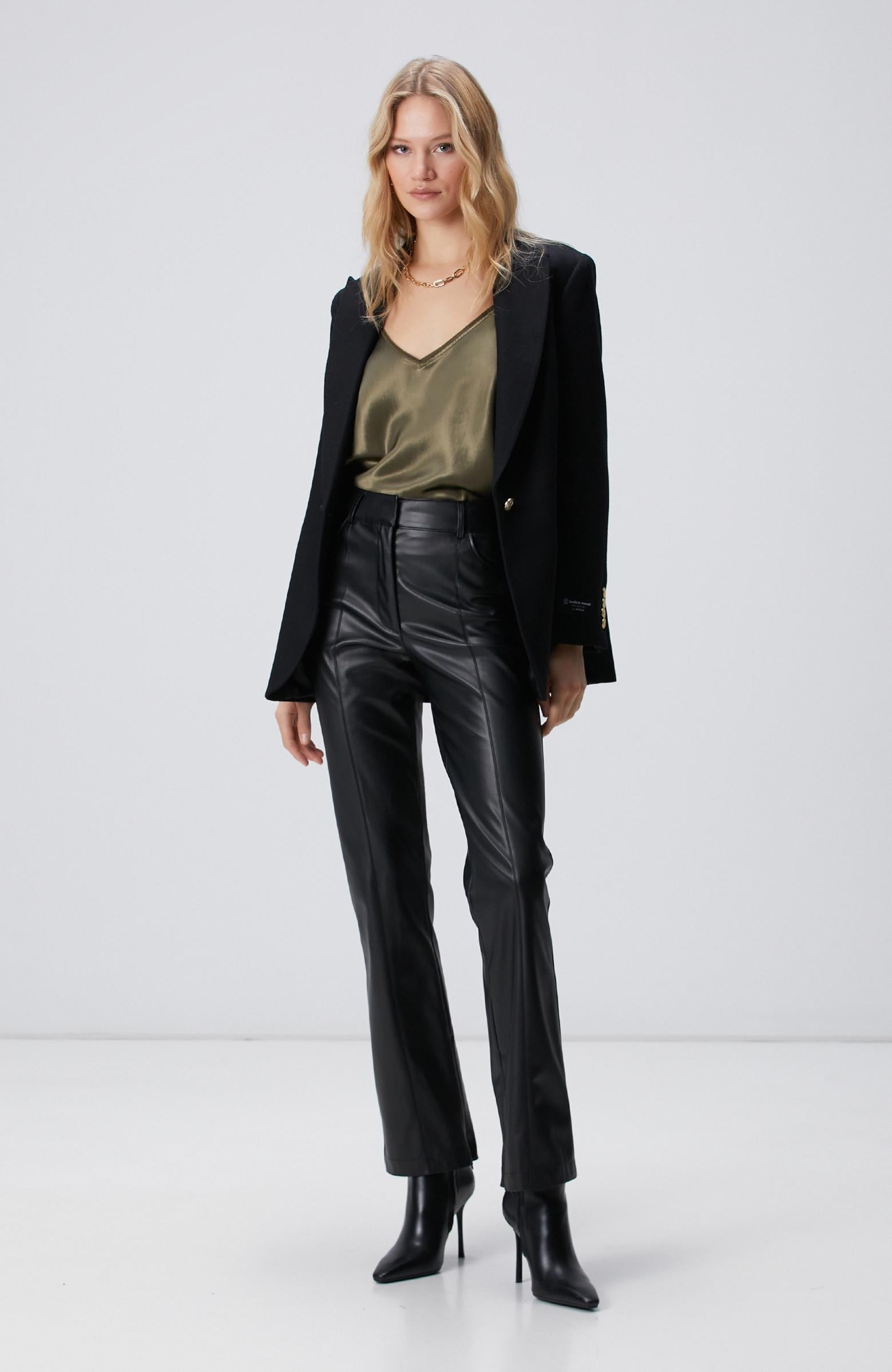 Açıklama : %50 Polyester;%50 Poliüretan;Regular Fit; Yüksek bel; Düz paça; Cepli; Vegan deri pantolon