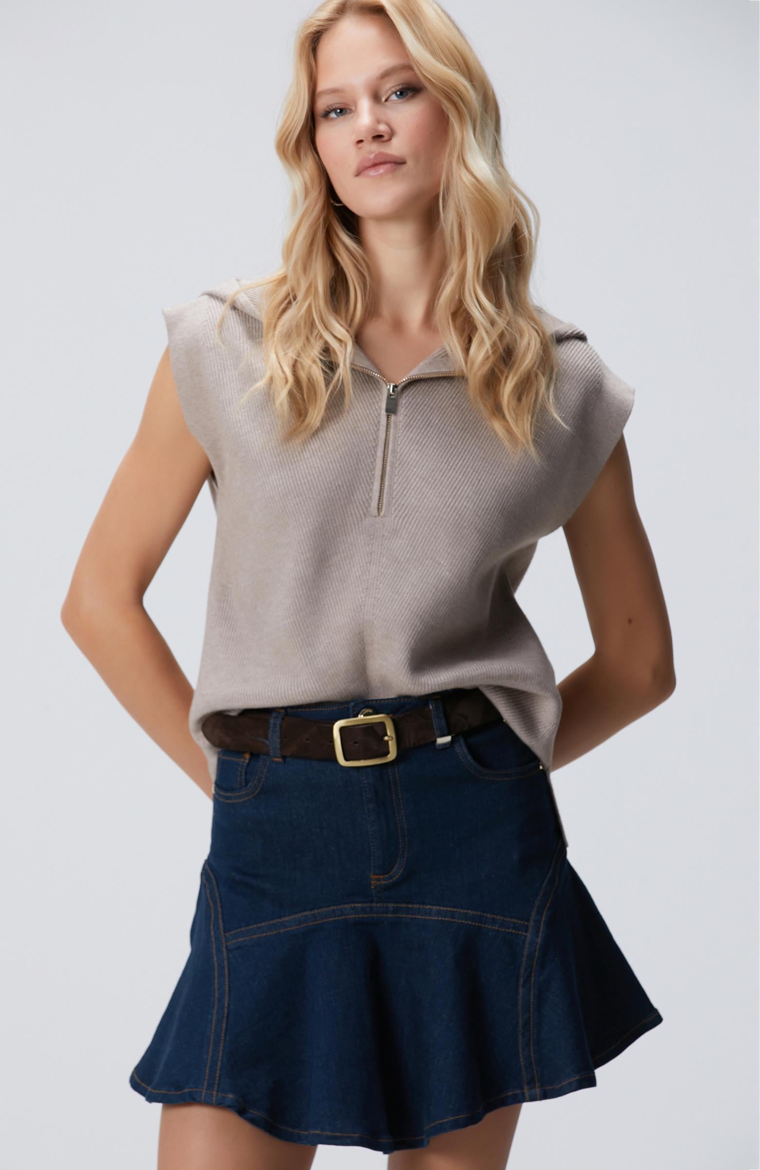 Network Kadın Vizon Verev Desen Örgü Kapüşonlu Kolsuz Kazak