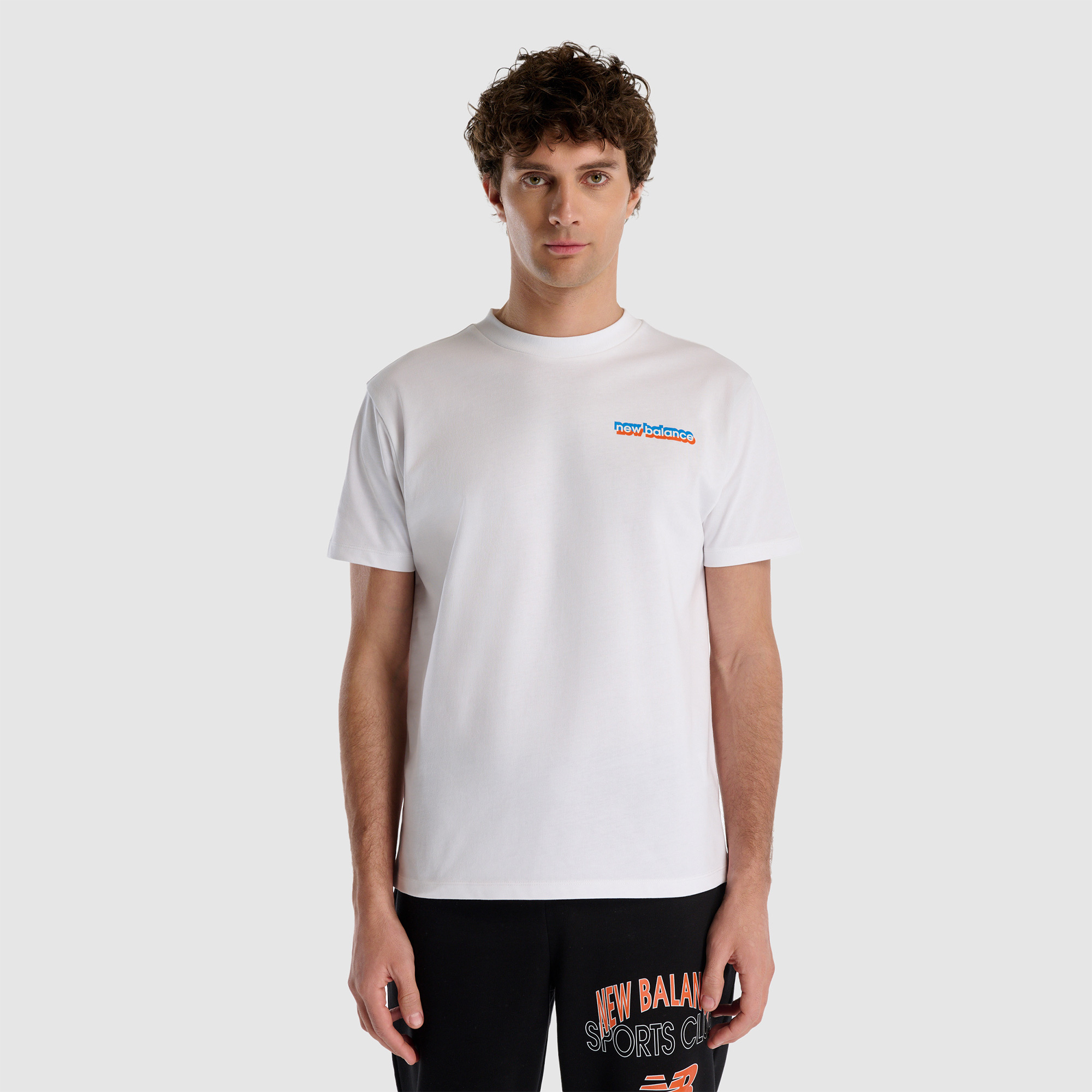 Temiz beyaz New Balance tişört, sade ama etkili bir detay isteyenler için ideal.