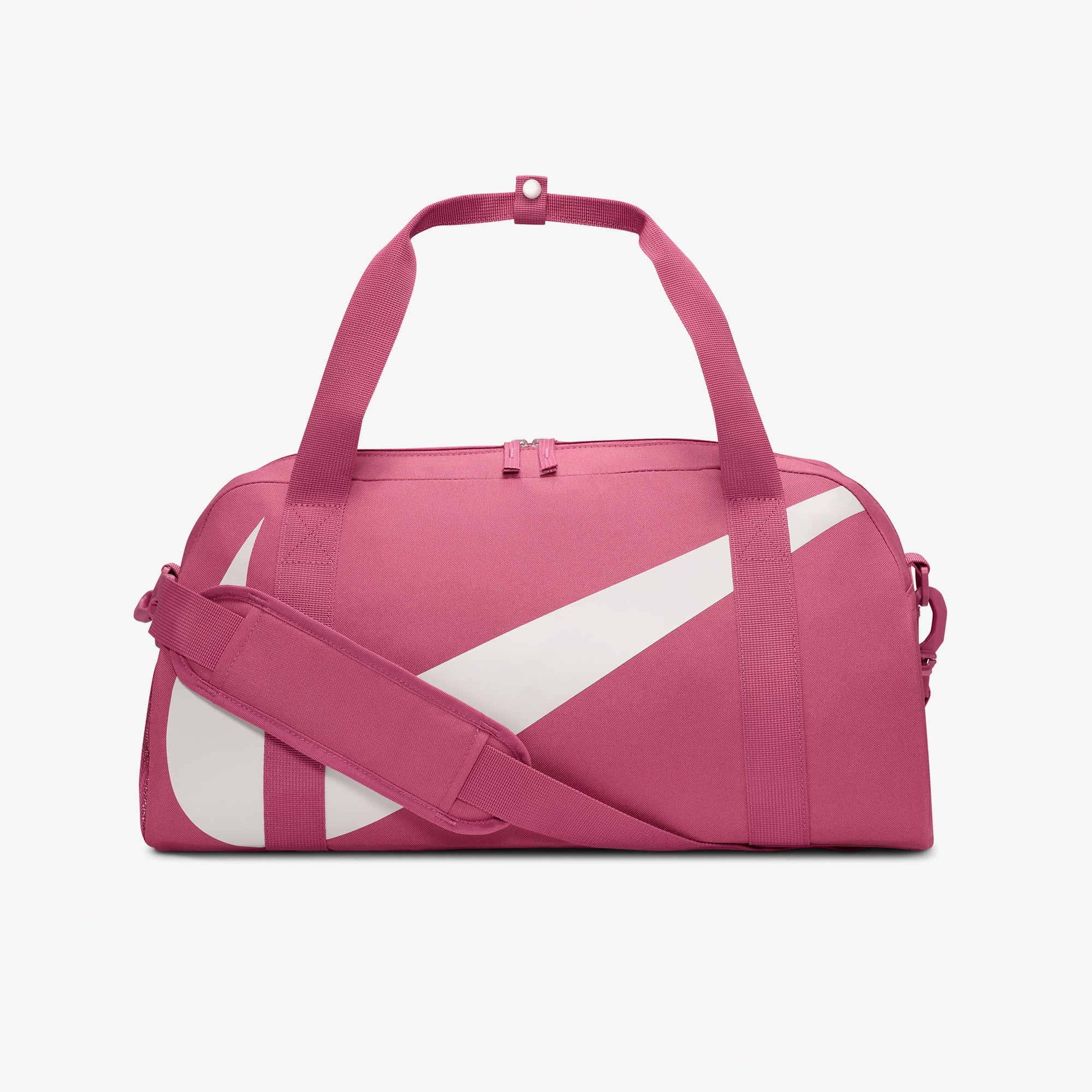 Nike Gym Club Çocuk Pembe Spor Çantası'nın çift fermuarlı ana bölmesi, eşyalarına kolayca erişim imkanı sunar.