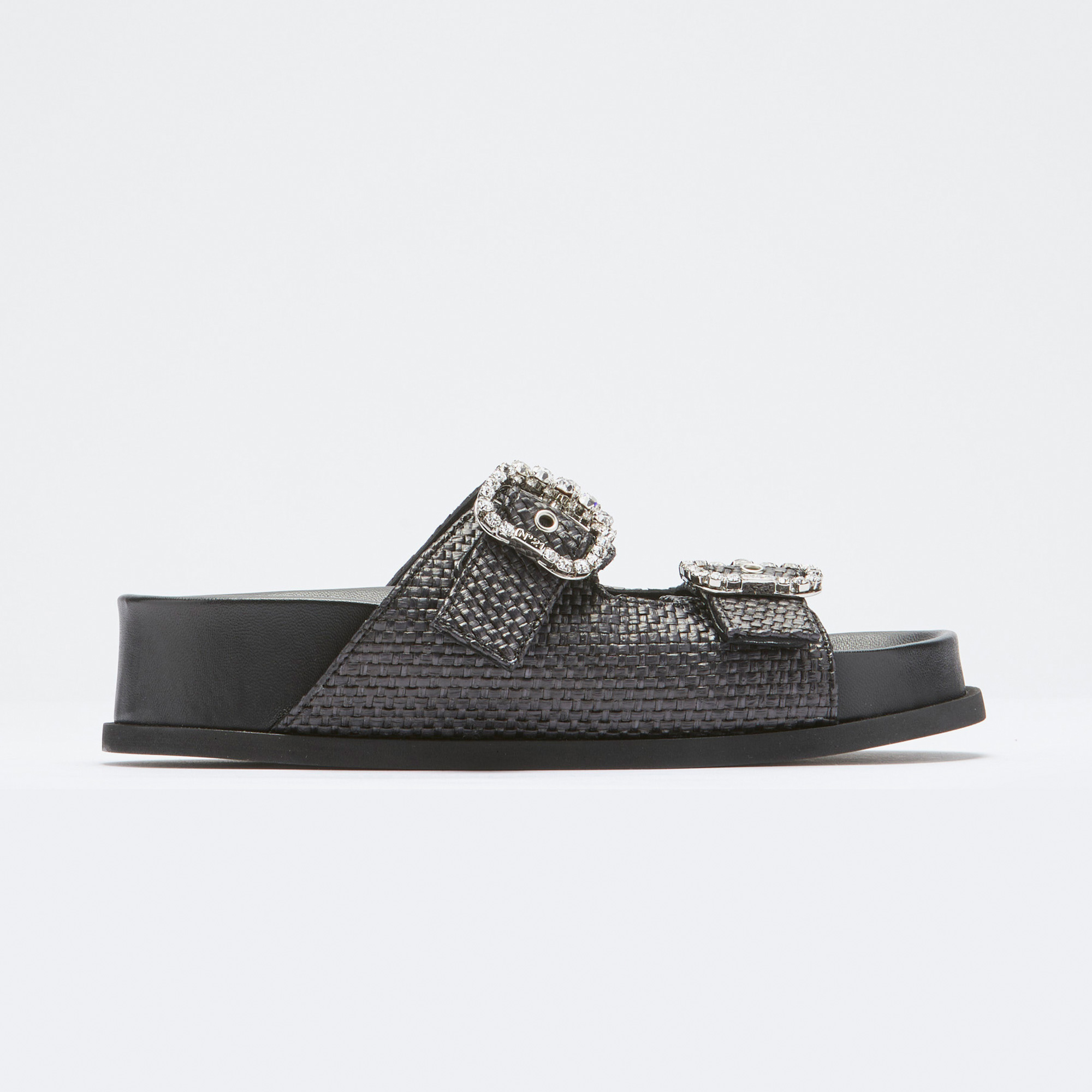 NO21 kadın terliği ile şıklığı ve rahatlığı bir araya getir! Bu zarif tasarım, dokulu siyah deri yüzeyi ve kristal detaylı tokalarıyla göz alıcı bir görünüm sunuyor. İster günlük kombinlerinde ister özel günlerde tercih et, bu ayakkabı her ortamda stilini yansıtmanı sağlayacak.