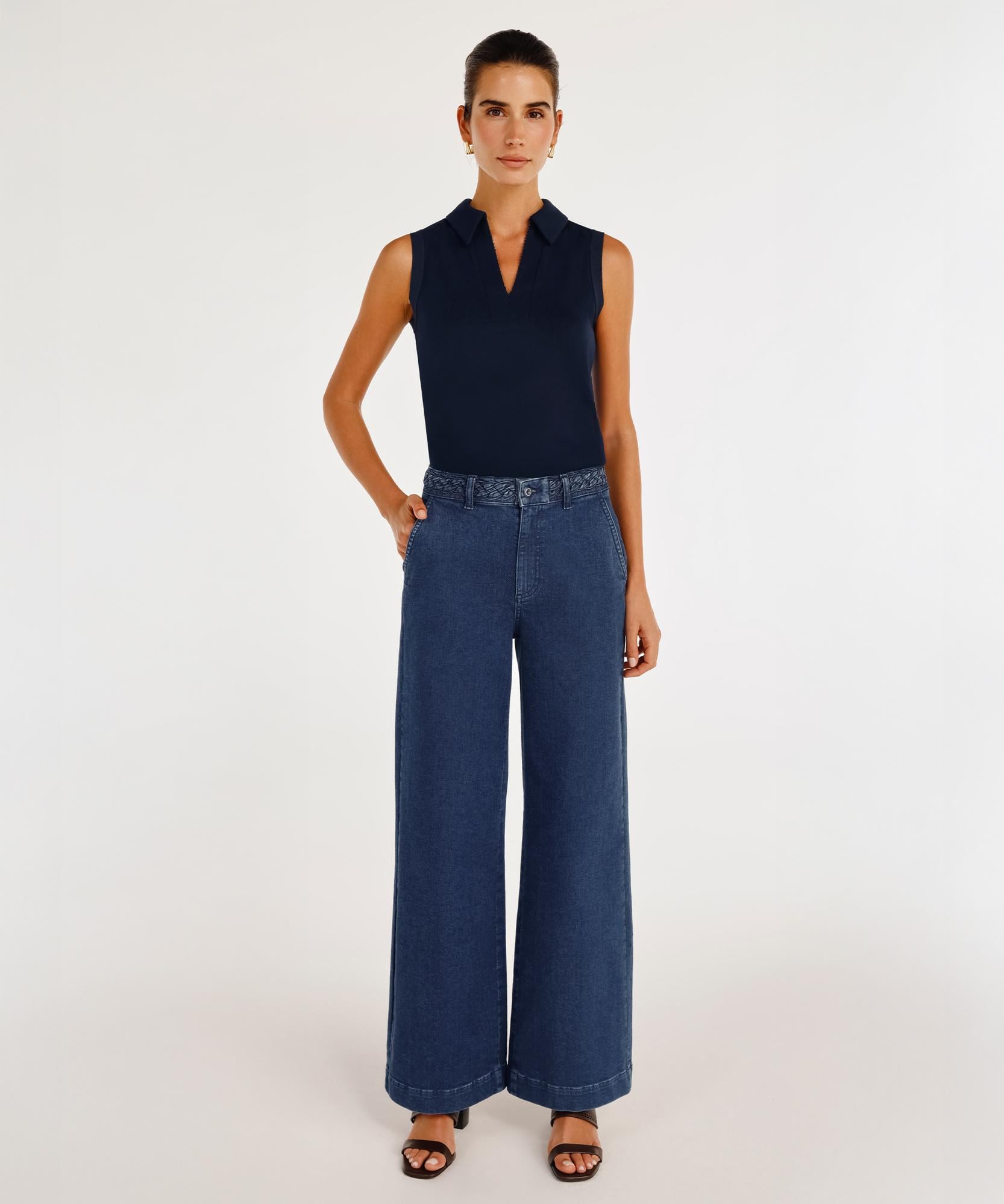 Örgü Kemer Detaylı Yüksek Bel Geniş Paça Denim Pantolon