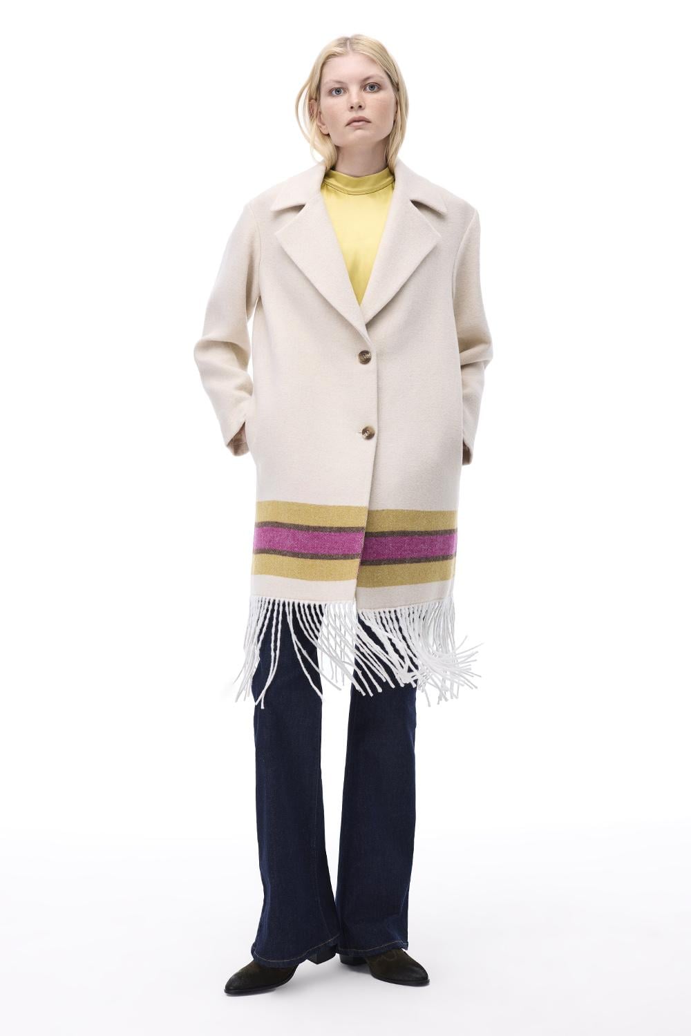 Pleasant Rahat Kalıp Diz Boy Ceket Yaka Bej Renk Kadın Kaban