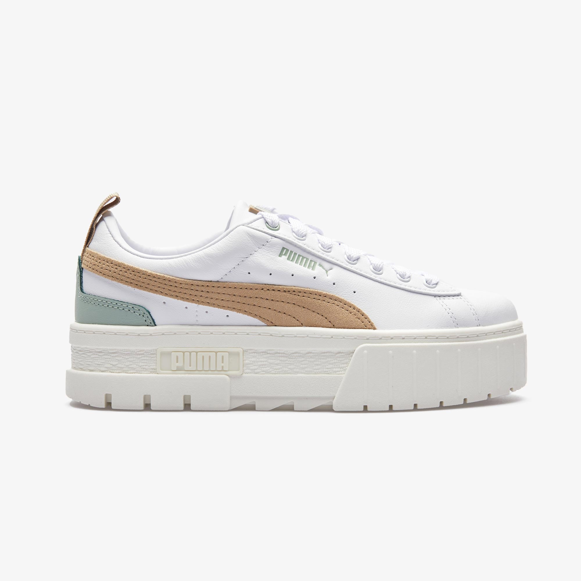 Puma Mayze Lth Kadın Beyaz Spor Ayakkabı ile sokak stilini yükselt! Bu şık ve modern platform sneaker, her adımda dikkat çekici bir görünüm sağlar. Ayakkabının üst yüzeyi, deri ve süet katmanlar ile güçlendirilmiştir ve tam bağcıklı kapanışı ile mükemmel uyum sağlar. Kalın platform kauçuk orta taban ve dokulu detaylar, ayakkabıya hem stil hem de konfor katar.