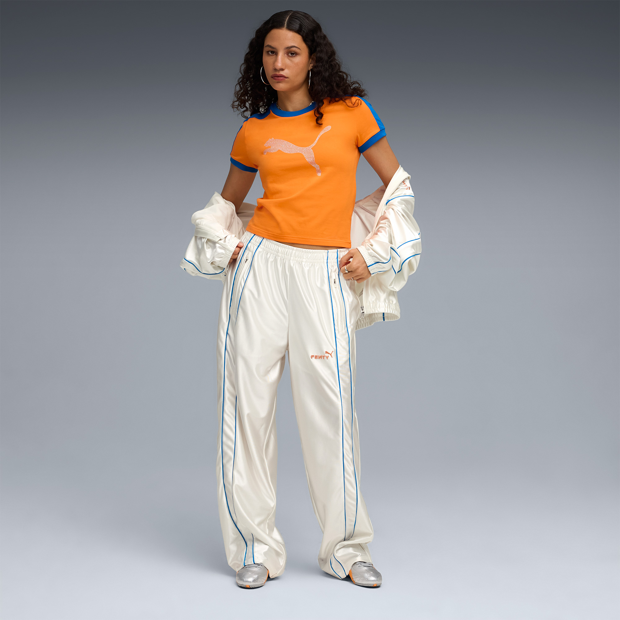 Puma X Fenty T7 Kadın Beyaz Eşofman Altı, Rihanna'nın Fenty x PUMA koleksiyonunun modern ve rahat bir tasarımıdır. Yumuşak kumaşı ve rahat kesimi, günlük kullanımda konfor sağlar. Büzgülü elastik bel bandı, mükemmel uyum sunar ve hareket özgürlüğü tanır. T7 şeritleri, eşofman altına özgün bir stil katarken, kontrast detaylar ve zarif dikişler tasarımı tamamlar. Hem spor aktivitelerinde hem de sokak stilinde rahatça kullanılabilir.