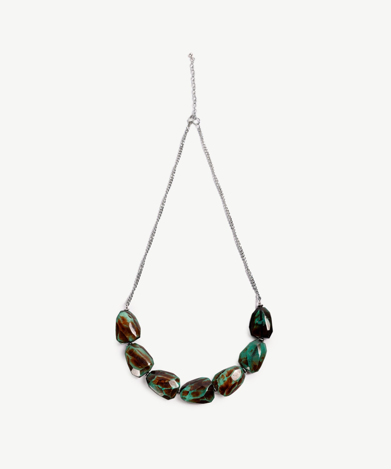 Materyal: recine | Ürün Ölçüleri: Naturel renkli büyük taşlı kolye ince ve zevkli detaylarla estetik tarzını tamamlayan kadınlar için ideal. Yarım balıkçı monokromatik kazakların üzerine takabilir, ışıltılı göz alıcılığınızı yükseltebilirsiniz.