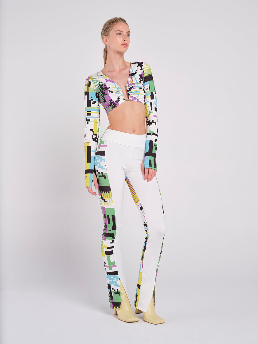 Yumuşak tuşeli, u şeklinde tokaya sahip göğüs detaylı, baş parmak bölmeli ve özel koleksiyon baskılı crop top. Elastan içeriğinden dolayı esneme payı mevcuttur. Vücuda oturan bir forma sahiptir.